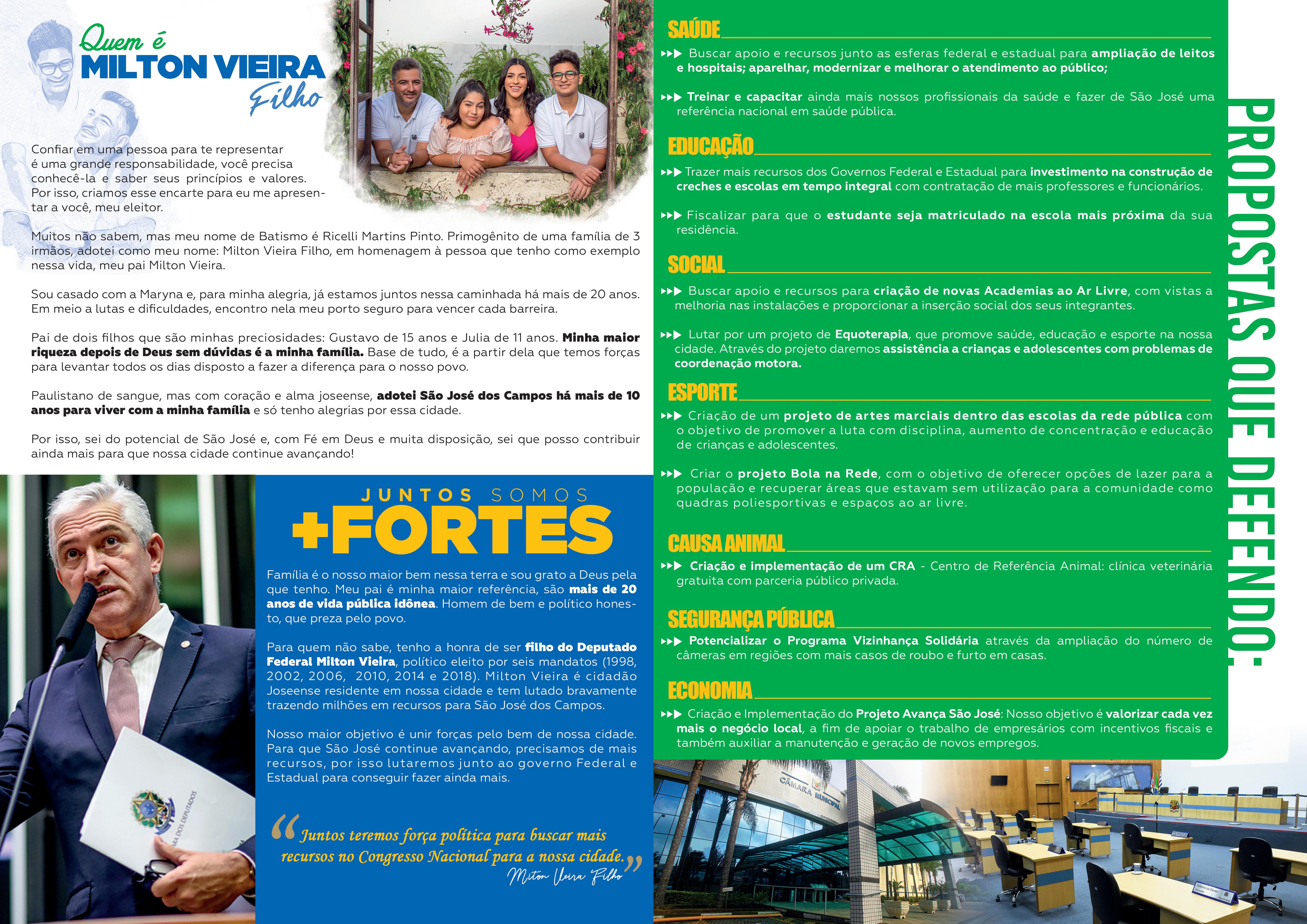 O informativo "São José Precisa Avançar – Vereador Milton Vieira Filho 10.300" foi elaborado como um material de campanha para as eleições de 2022, destacando as propostas e o compromisso do candidato com o desenvolvimento da cidade. Com uma linguagem acessível e objetiva, o material apresenta soluções para os principais desafios locais, reforçando a necessidade de avanços para a população. A estrutura visual e textual foi pensada para transmitir credibilidade e engajamento, conectando o eleitor às ideias de Milton Vieira Filho e incentivando seu apoio nas urnas.
