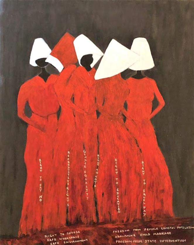 The exhibition, ACCESS, explores gender equality and broader issues around access such as race, LGBTQIA+ rights, reproductive rights, patriarchy, child and elder care, and immigration. Some of the works pay tribute to women who fought for rights, while others share personal struggles, and still others declare grievances against the patriarchy.