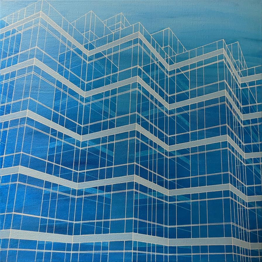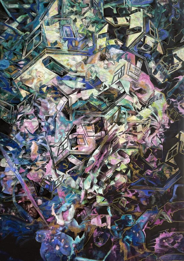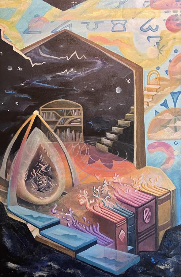 This painting intends to depict the many portals of my mind. I wanted to give a sense of travel through windows (planes) to represent the transitions from thought to thought or from activity to activity.