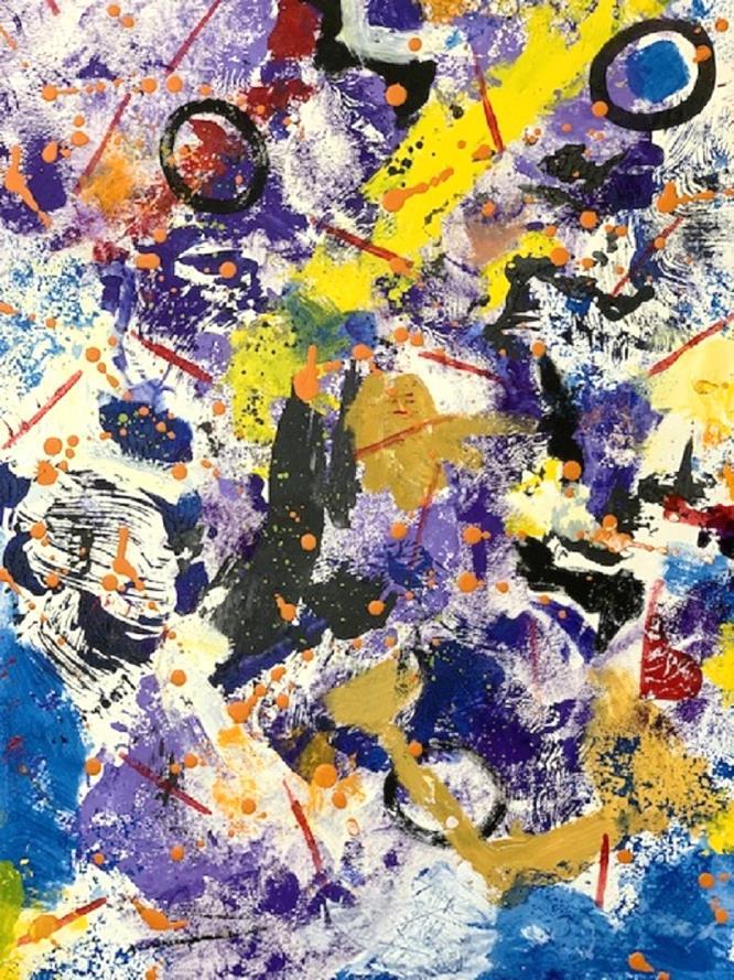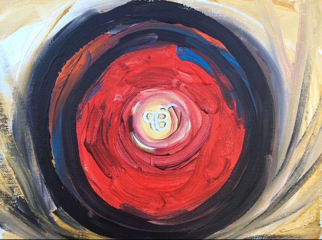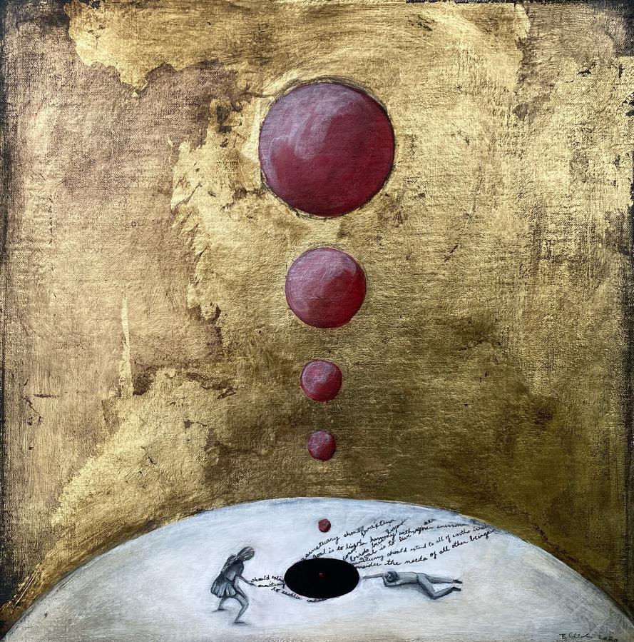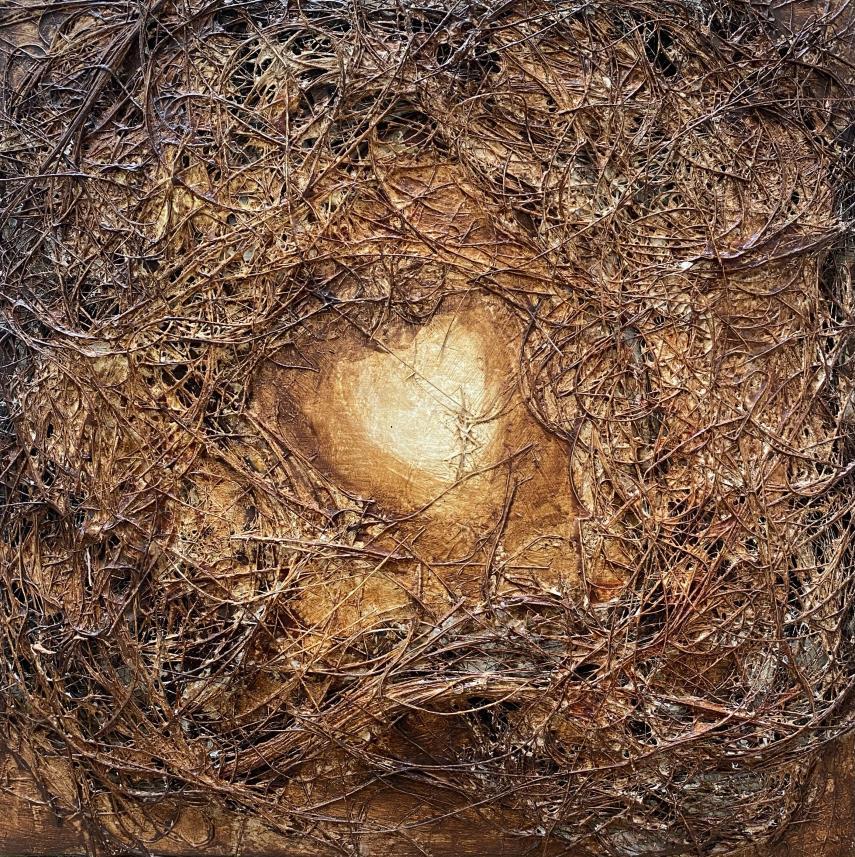 into personal growth, self-actualization, and transcendence through meditation.” Cecile Picard’s “OpeningoftheHeart “is an inward voyage, a meditation on the qualities of the heart and the mind such as: the mind wants, the heart knows. This painting is a portal to the core of our being, inviting the viewer to introspect and marvel!” I am mesmerized with the circling text and drawn in, wanting to learn the secrets in the golden center.