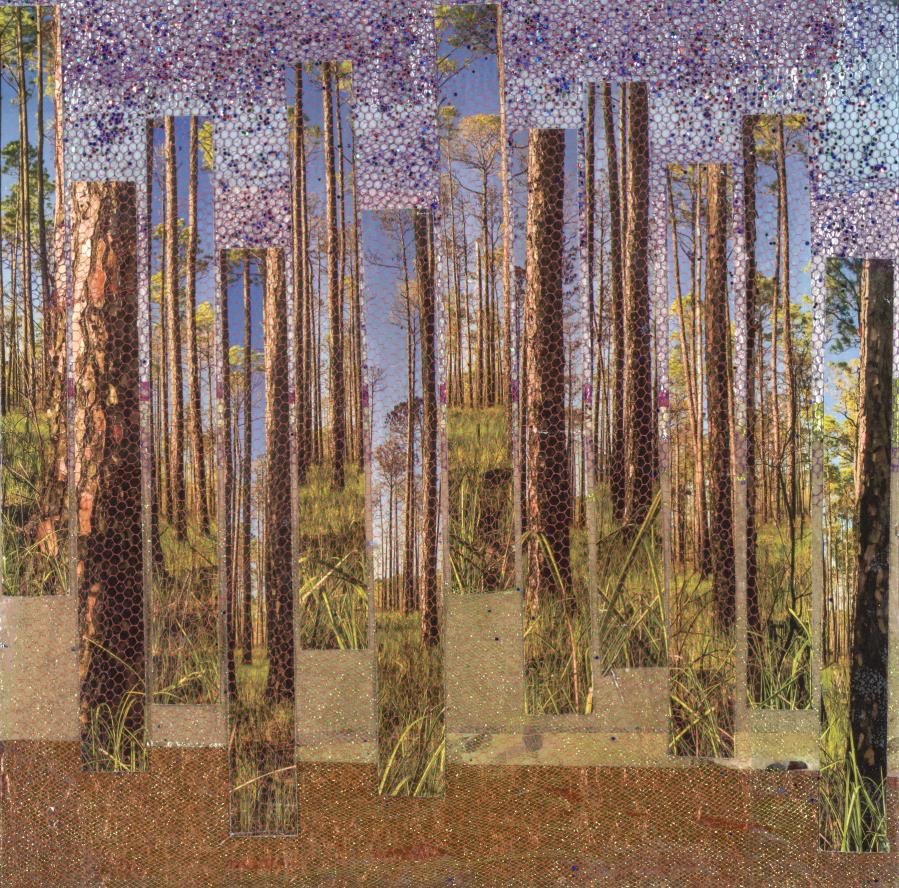 Sand Portals , by Elizabeth Bloomfield, glow, radiate warmth and the peacefulness of the infinite ocean. Sensuous and shimmering, one can feel the heat of the sun, as if walking on the beach. As Elizabeth states: “My work focuses on distinct natural phenomena. The pieces reflect transitions (portals) from analytical thinking to a state of awe, and experiencing oneness in nature, specifically in the presence of thick fog, intense storms, or within arched sandstone canyons. Sand Portals offers the feeling of witnessing a moment in geological time.”