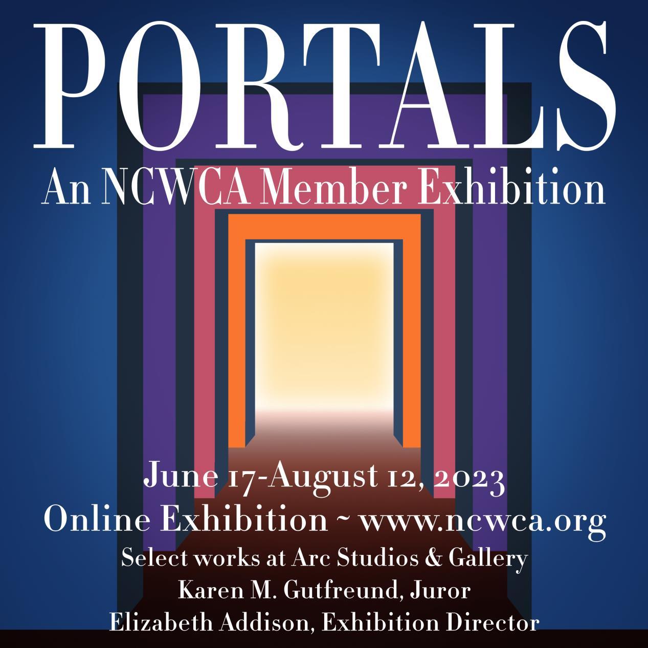 From the prospectus: Portals can be an opening into new realities. They conjure images of liminality, shimmering lights, whirling openings to otherworldly realms, gateways that allow energy to pass between dimensions, or doorways for the world of matter to commune with spirit. In our dayto-day lives, a portal could have a magical or disorienting effect, perhaps causing us to forget why we entered in the first place. A portal may serve to bridge the gap between the perception of another and the reality of that other. Or a portal might signify personal growth, self-actualization, or transcendence. NCWCA asked for artwork that tells a story, invites the viewer into other realms, evokes transcendence,