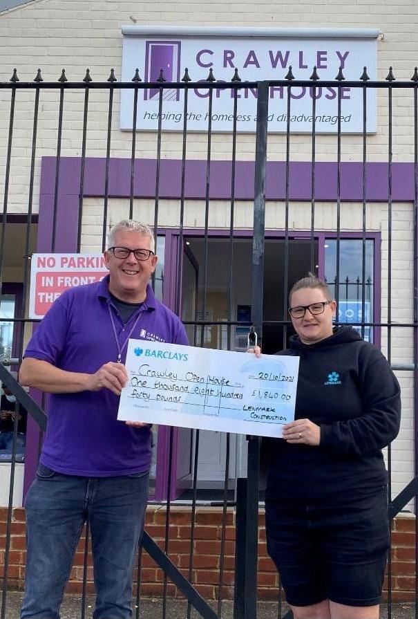 Harriet Nugent presents the cheque to Ian Wilkins of Open-house a charity for the homeless in Crawley