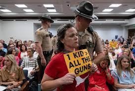 One of a dozen grieving parents from the Covenant School shooting holding an anti-gun poster is forcibly removed from the Tennessee state hearing on gun control. Source: PBS.com