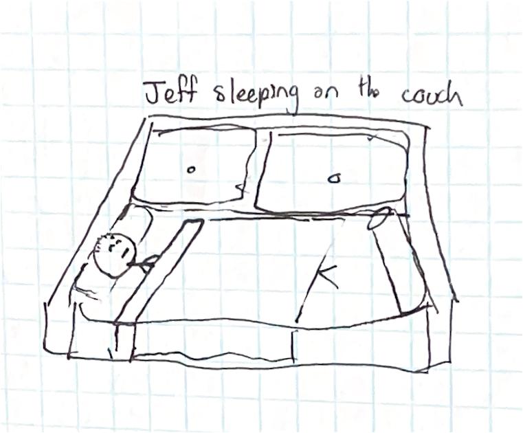 Energy comes next. Energy is a property of an object that is either moving or has the capacity to move. For example, Fred is sitting on the couch. If Fred is able to get up, then he has energy; if not, Fred will have to sleep on the couch. (See image on pg. 5.) Energy can really be split into two categories: potential energy and kinetic energy. Tip: Ignore potential energy when dealing with problems because it doesn’t actually exist.5 There is a simple equation for kinetic energy: 1+1=12. Interpretation: If you have one thing moving one meter per second then it has 12 dK/dc of energy.6 As you can tell, energy is by far the easiest physics quantity to Work7 with.