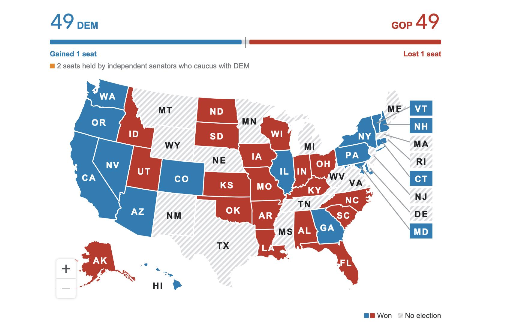 Google’s election map shows an even split in the Senate. Source: Google