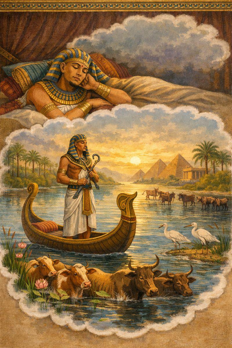 original dreams. The biggest difference between them, is that the Torah says "הערפו לע דמוע הנהו ,םלוח רואיה” - "Pharaoh was dreaming, and he stood on the Nile" And Pharaoh says “דמוע יננהו רואיה תפש לע” - "And I stood on the Nile’s bank" The difference is that standing on the bank is more admirable than standing on the Nile itself, so Pharaoh changed it, out of arrogance. After that, Yosef is interpreting the dream, and Pharaoh tells his servants "Could we find another like him? A man with divine spirit?” This part is pretty weird. Pharaoh couldn't know at the time that Yosef was right - so why did he assume that Yosef has a divine spirit?