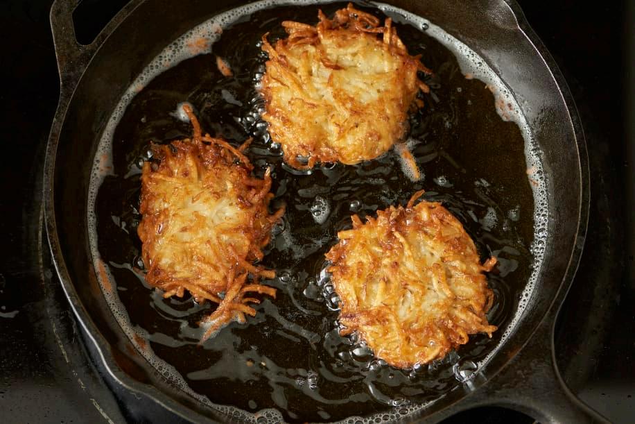 Latkes sizzling over stove. Source: https://www.thekitchn.com/