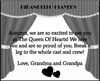 AUTUMN CAPES (Queen of Hearts) is currently a senior at SBHS and is thrilled to be performing in her seventh Pirandello Players production! Some ofAutumn’s past roles with Pirandello include playing “Amy March” in Little Women, “Juror 4” in 12 Angry Jurors, and “Morticia” in The Addams Family Autumn would like to thank her whole family for their continuous support of her love for the arts, and of course, putting up with crazy rehearsal schedules!Autumn would also like to thank Mrs.Trader, Mr.A, and Mrs. Bufis for all of their hardwork and dedication to Pirandello. Finally,Autumn would like to thank the cast and crew for being such wonderful and encouraging peers to perform alongside! Best of luck to everyone, and break a leg!