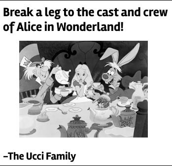 ABBYBUFIS (Cheshire Cat) is a Junior at SBHS and is so excited to be returning to the Pirandello Players family for Alice in Wonderland. Some ofAbby’s past roles include “Gwendolyn” (understudy) in A Murderer Among Us, “Rodrigo II” in Little Women, “Juror 11” in 12 Angry Jurors, and “GrandmaAddams” in The Addams Family.Abby would like to thank Mrs.Trader, Mr. Aand the rest of the amazing cast and crew for making this show the best it could be.To the wonderful cast, break a leg!