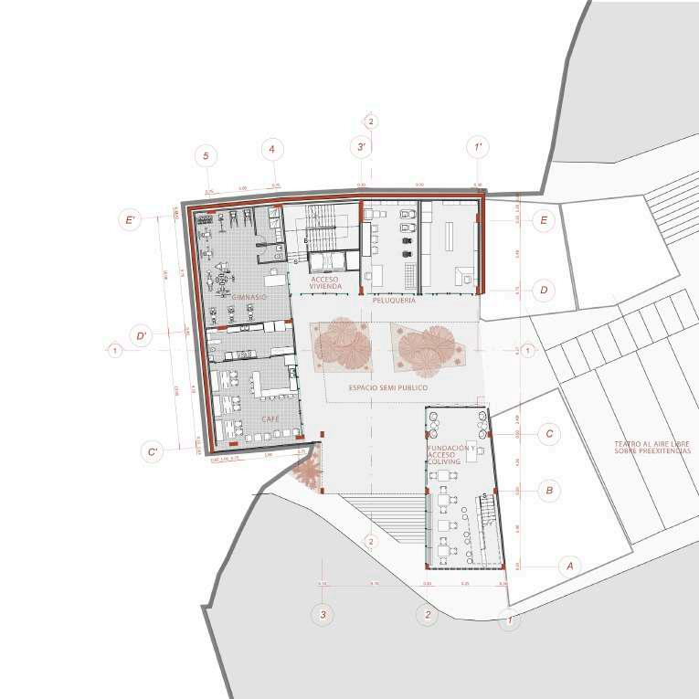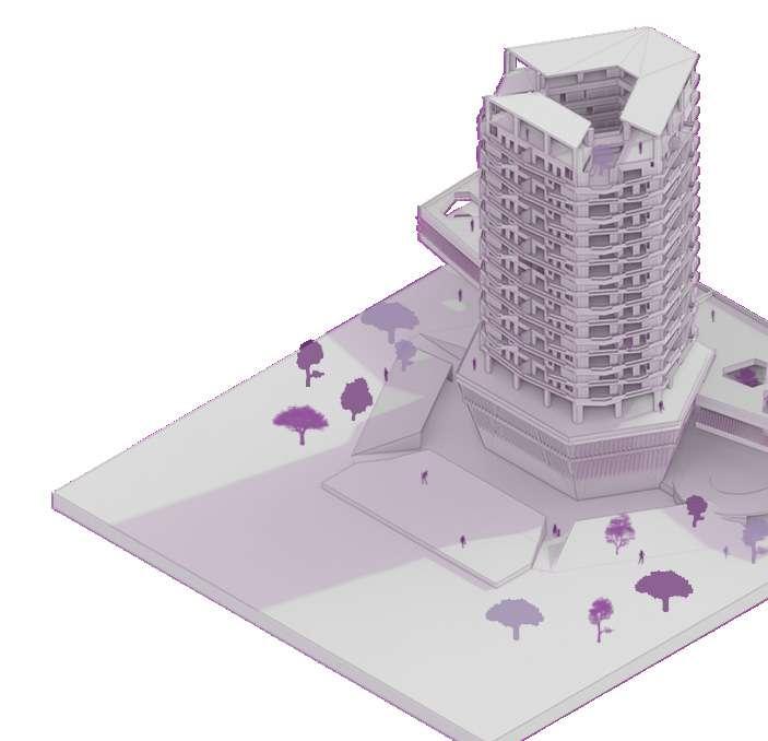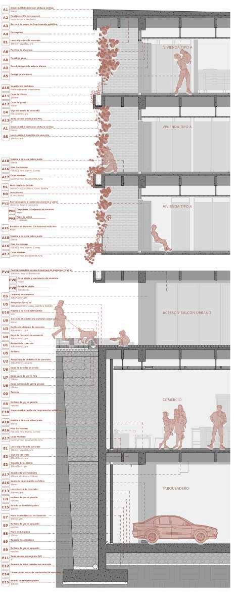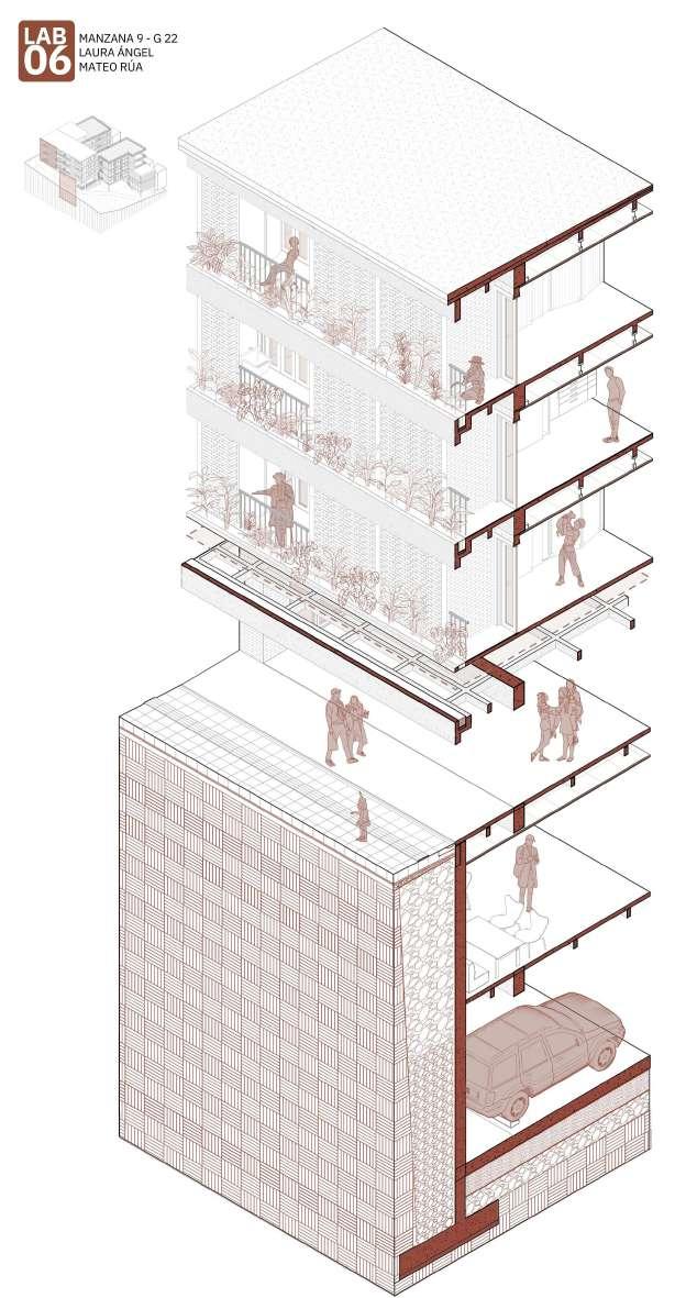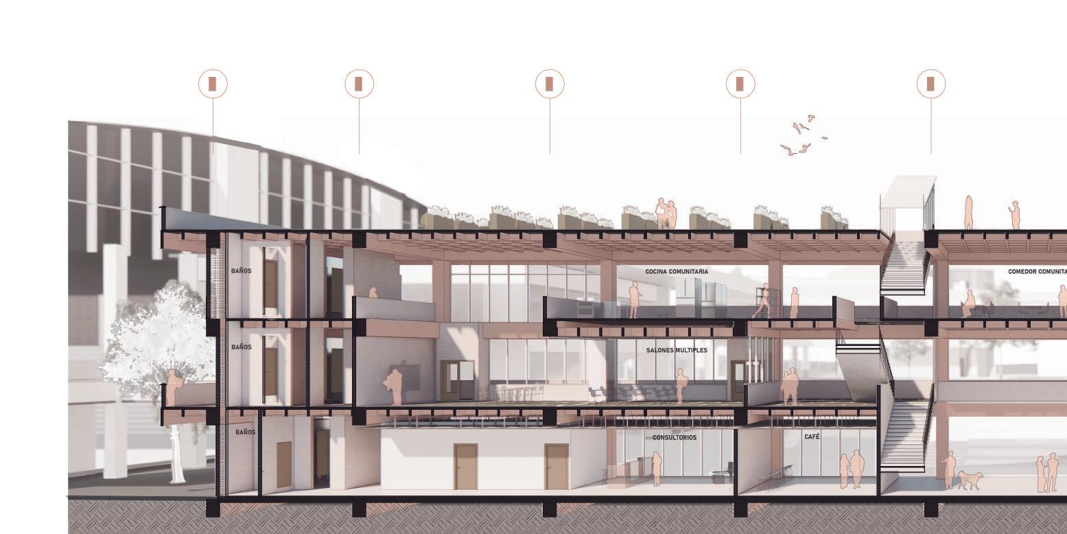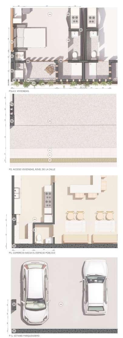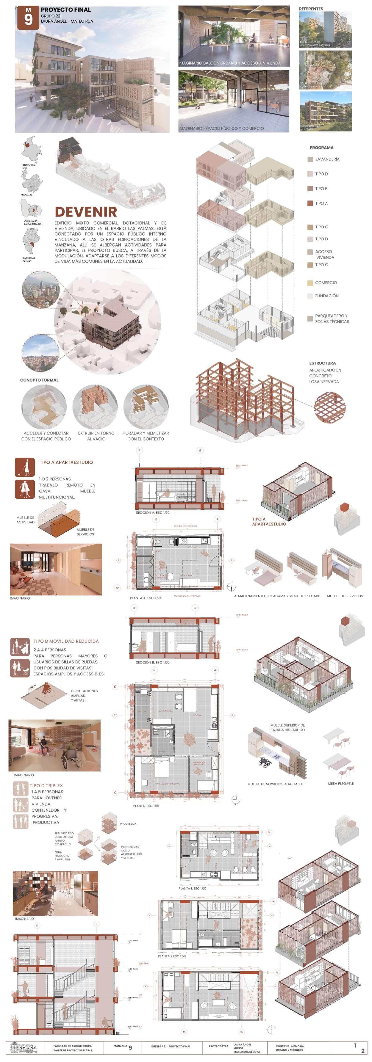 Edificio mixto comercial, dotacional y de vivienda, ubicado en el barrio Las Palmas, está conectado por un espacio público interno vinculado a las otras edificaciones de la manzana, allí se albergan actividades para participar, el proyecto busca a través de la modulación, adaptarse a los diferentes modos de vida que se contemplan en el proyecto, con esta misma modulación el edificio se escalona en diraccion a la que cae la montaña buscando resaltar la pendiente.