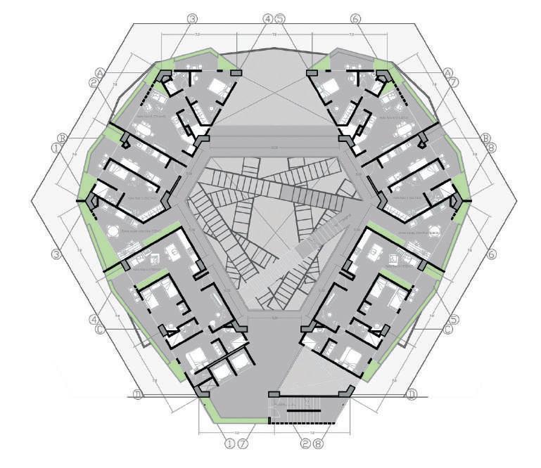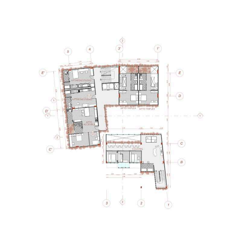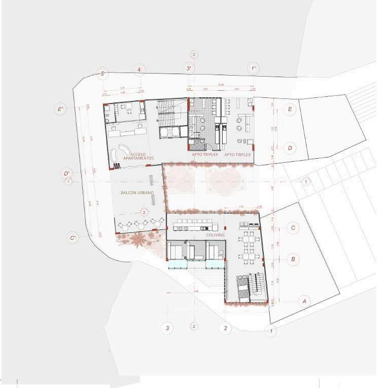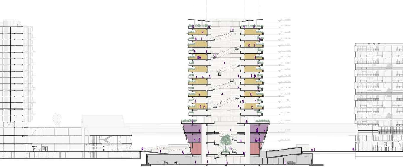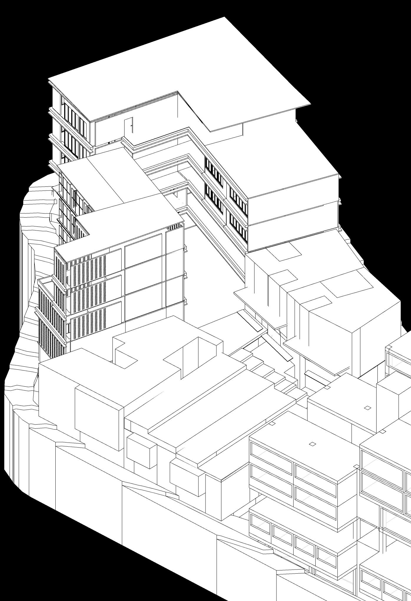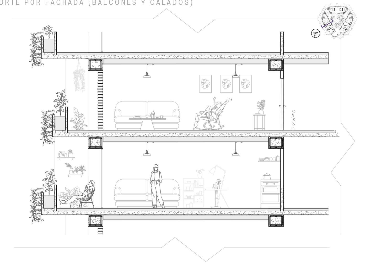 Edificio mixto comercial, dotacional y de vivienda, ubicado en el barrio Las Palmas, está conectado por un espacio público interno vinculado a las otras edificaciones de la manzana, allí se albergan actividades para participar, el proyecto busca a través de la modulación, adaptarse a los diferentes modos de vida que se contemplan en el proyecto, con esta misma modulación el edificio se escalona en diraccion a la que cae la montaña buscando resaltar la pendiente.