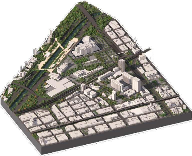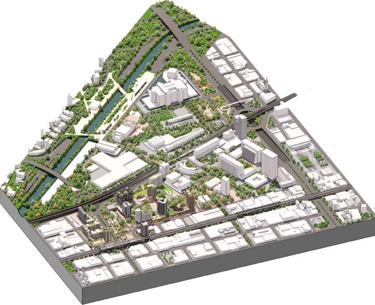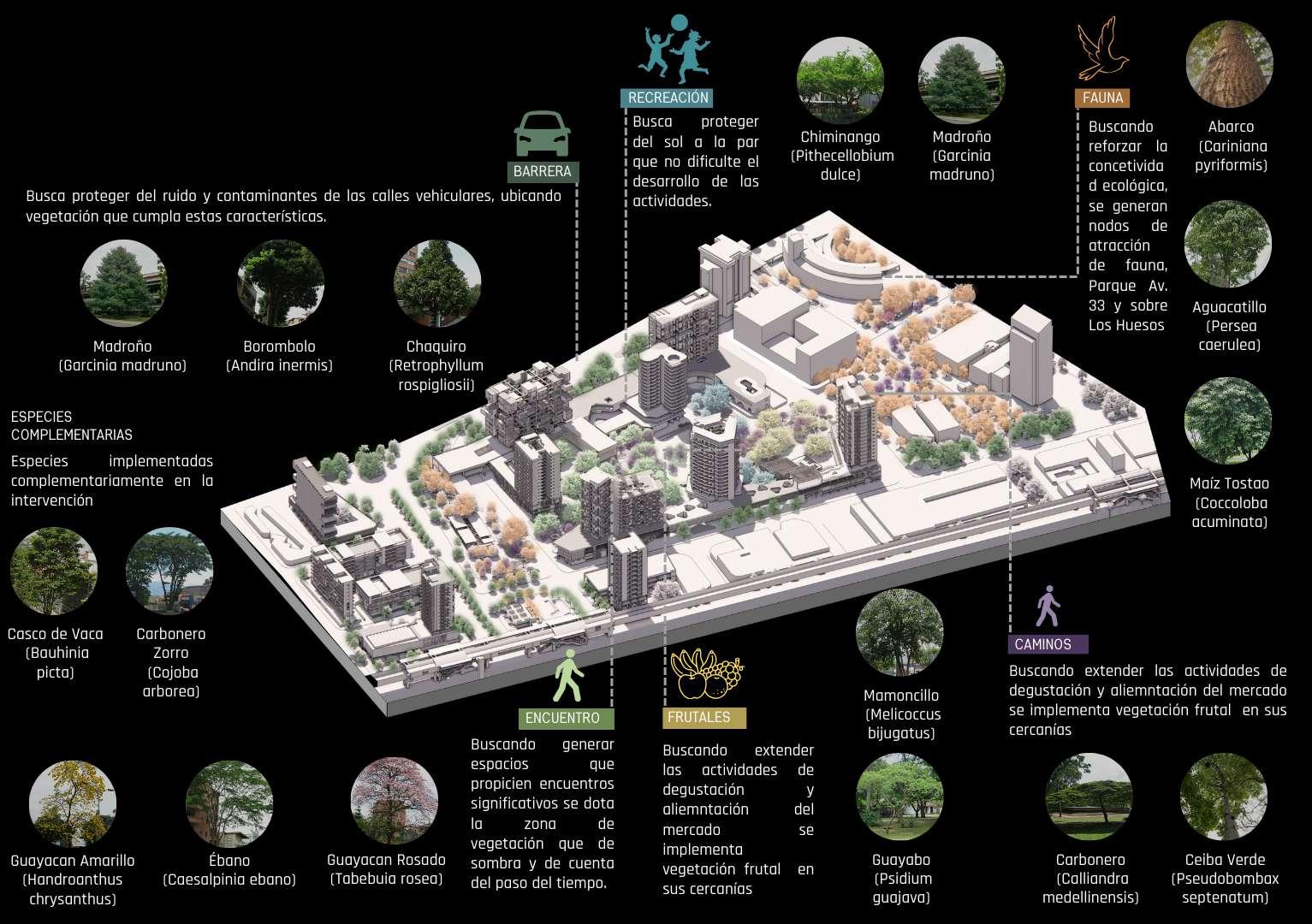 Aumentar el porcentaje de sostenibilidad del polígono conformado por las zonas Calle Nueva, Parques del Río, Alpujarra 1 y 2 de Medellín de 45% (sostenibilidad media) al 75% (sostenibilidad alta) aproximadamente, a través de un proyecto de complementación de usos y ampliación de la morfología urbana, a través de una centralidad de caracter automotriz predominante, configurada por un campus paramentada por medio de una cinta y torres libres que incluye el comercio e implementa vivienda, educación, reciclaje y energías renovables, a la vez que se conecta con la estructura ecológica de la ciudad a través del parque de la Avenida 33 y Los Huesos.