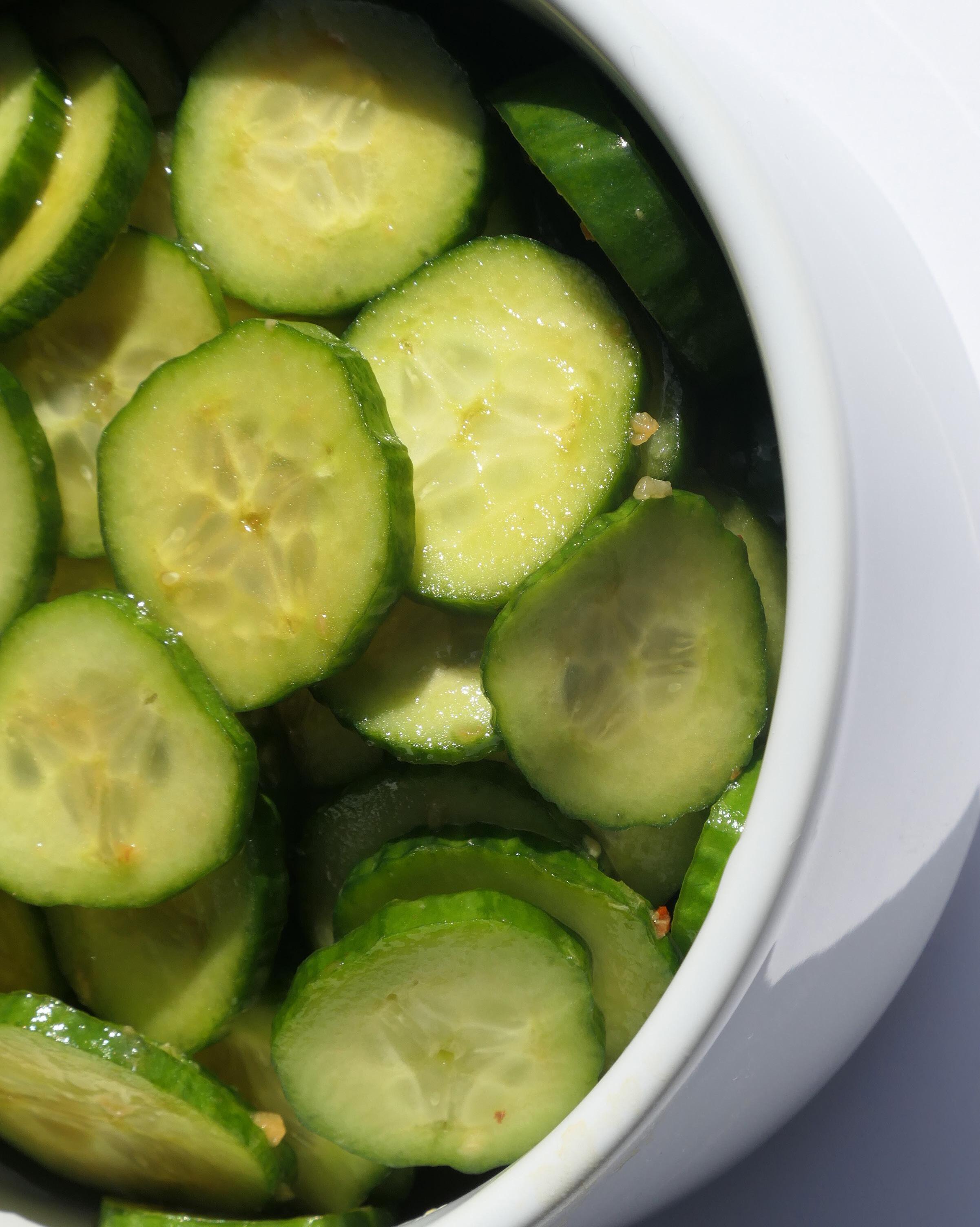 A rice bowl or even just as a crunchy snack on it’s own! Suggestion: if you like your cucumbers to stay crunchy, don’t put the sauce on until you’re ready to serve them. The longer the cucumbers sit with the sauce the softer they become.