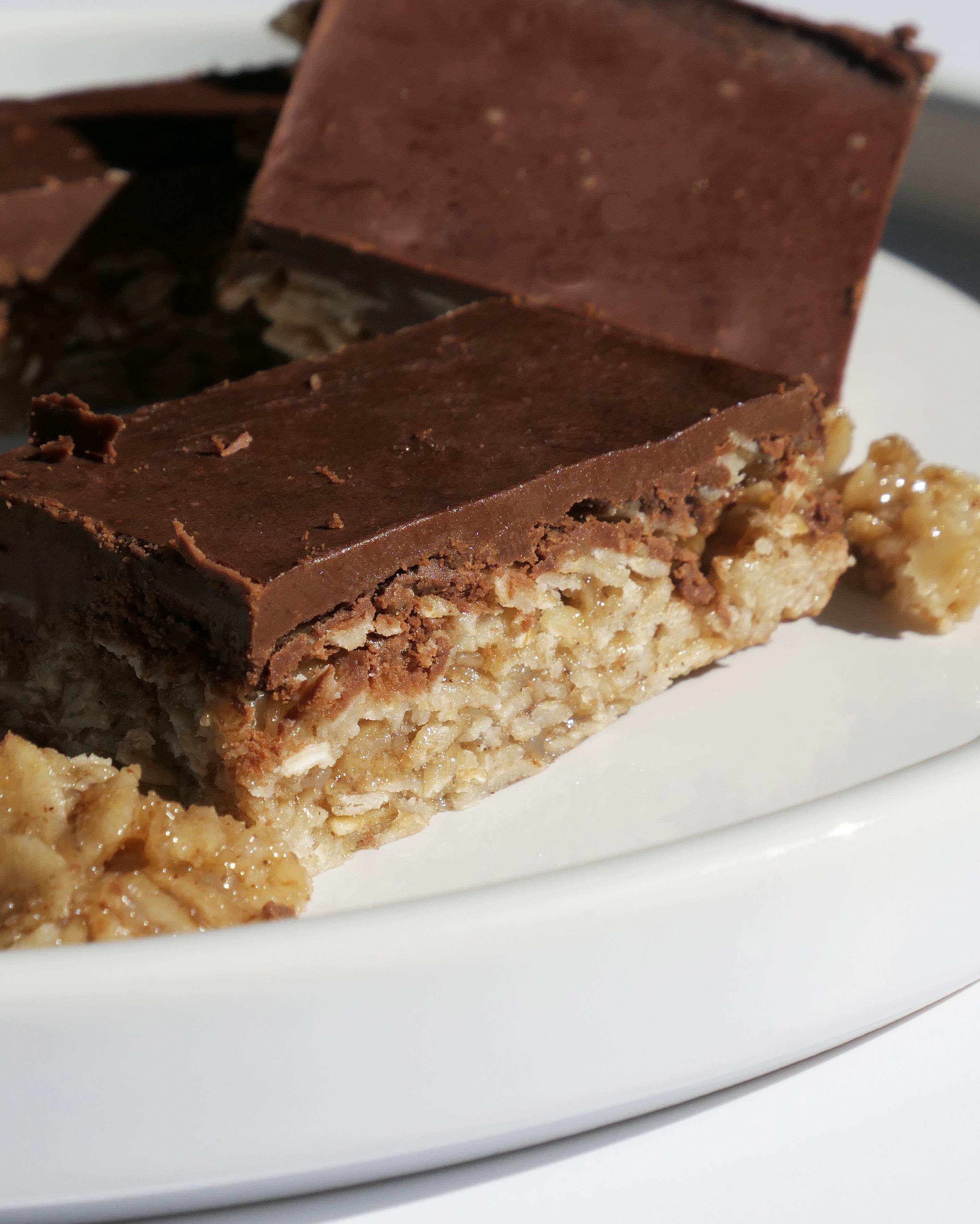 Pour chocolate over the dish of oats. Refrigerate for 4 hours or until set. Cut into square bars and enjoy!