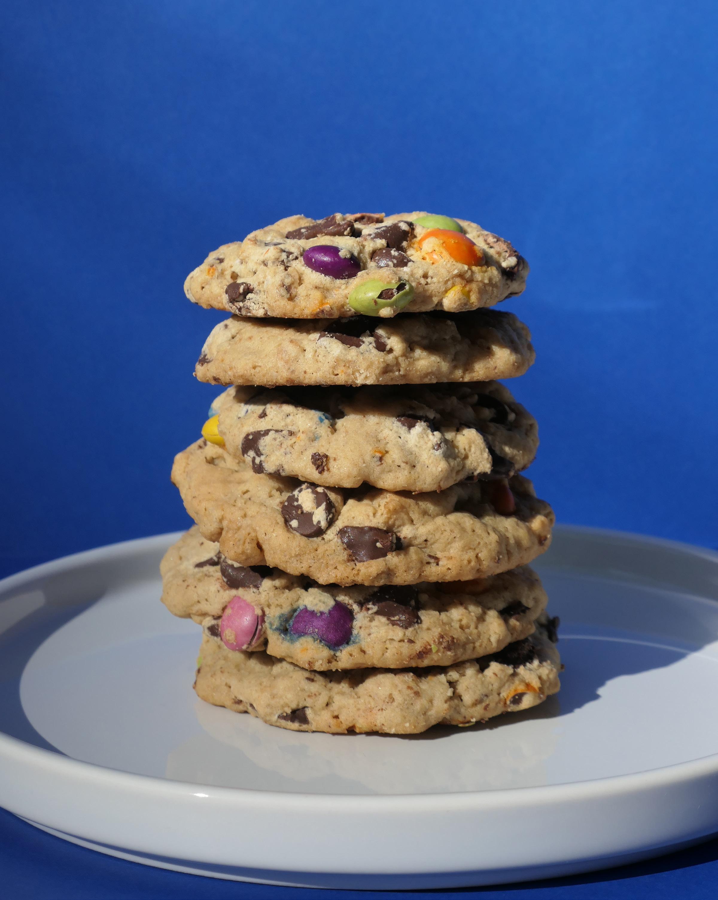 Add in the melted butter, egg, and vanilla. Hand or electric mix until fully combined. Mix in the chocolate chips and m&ms.