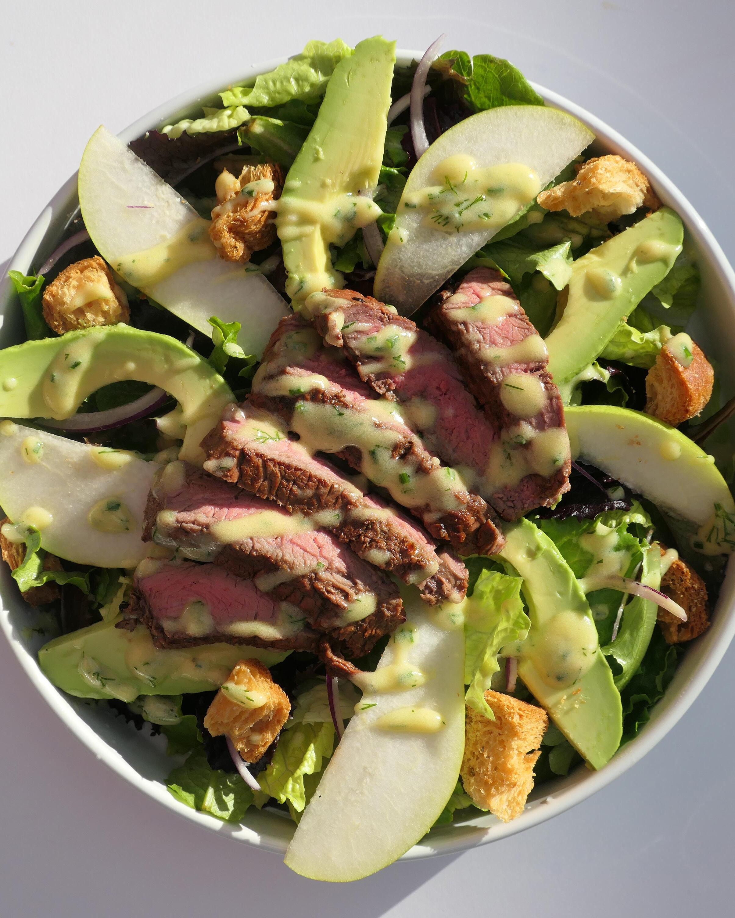 In large bowl combine both types of lettuce, red onion, sliced avocado, sliced pear, and croutons. Slice up steak and place on top of salad. Dress your salad to your liking. Enjoy!
