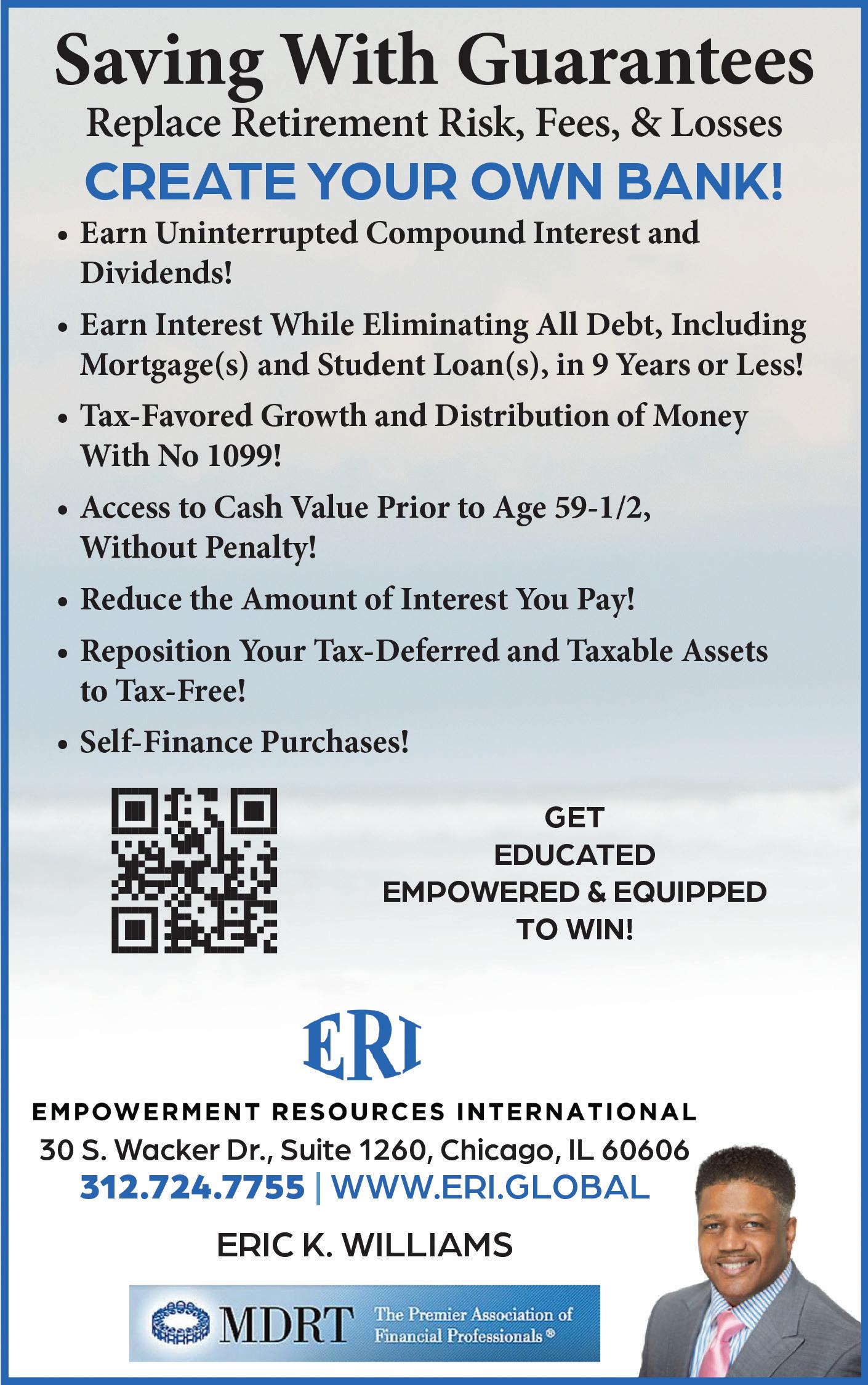 Black Pages International salutes Eric K. Williams for Building A Dynasty 2023-2032. 30 South Wacker Drive, Suite 1260, Chicago, IL 60606 Office: 312-724-7755 | Fax: 312-724-8548 I info@ERI.global | www.ERI.global