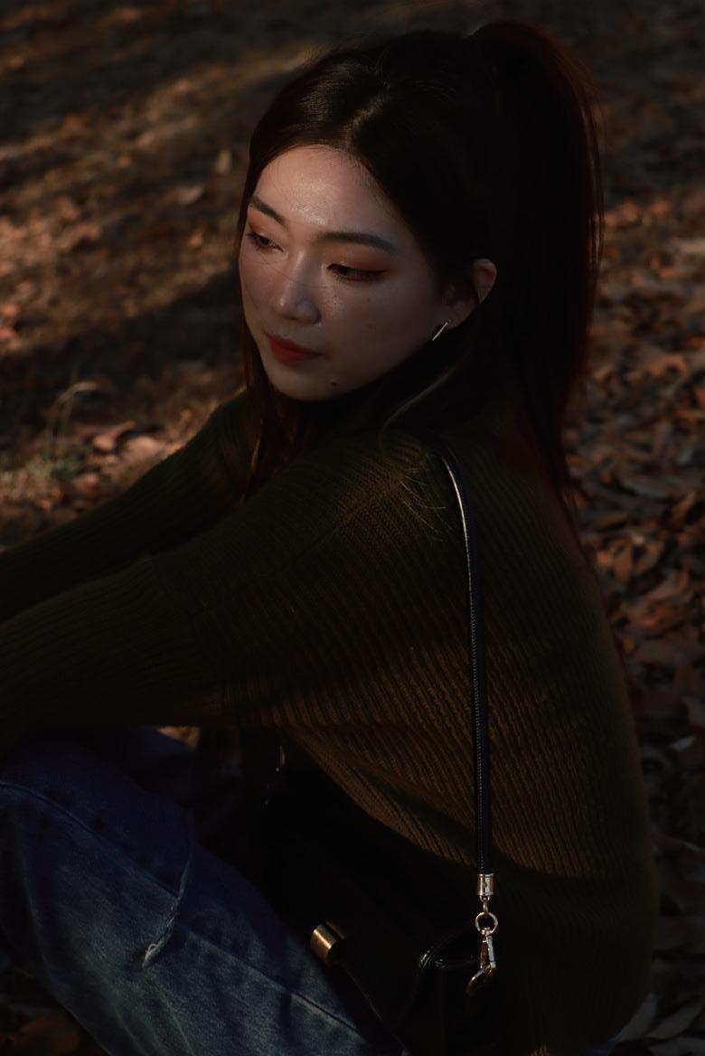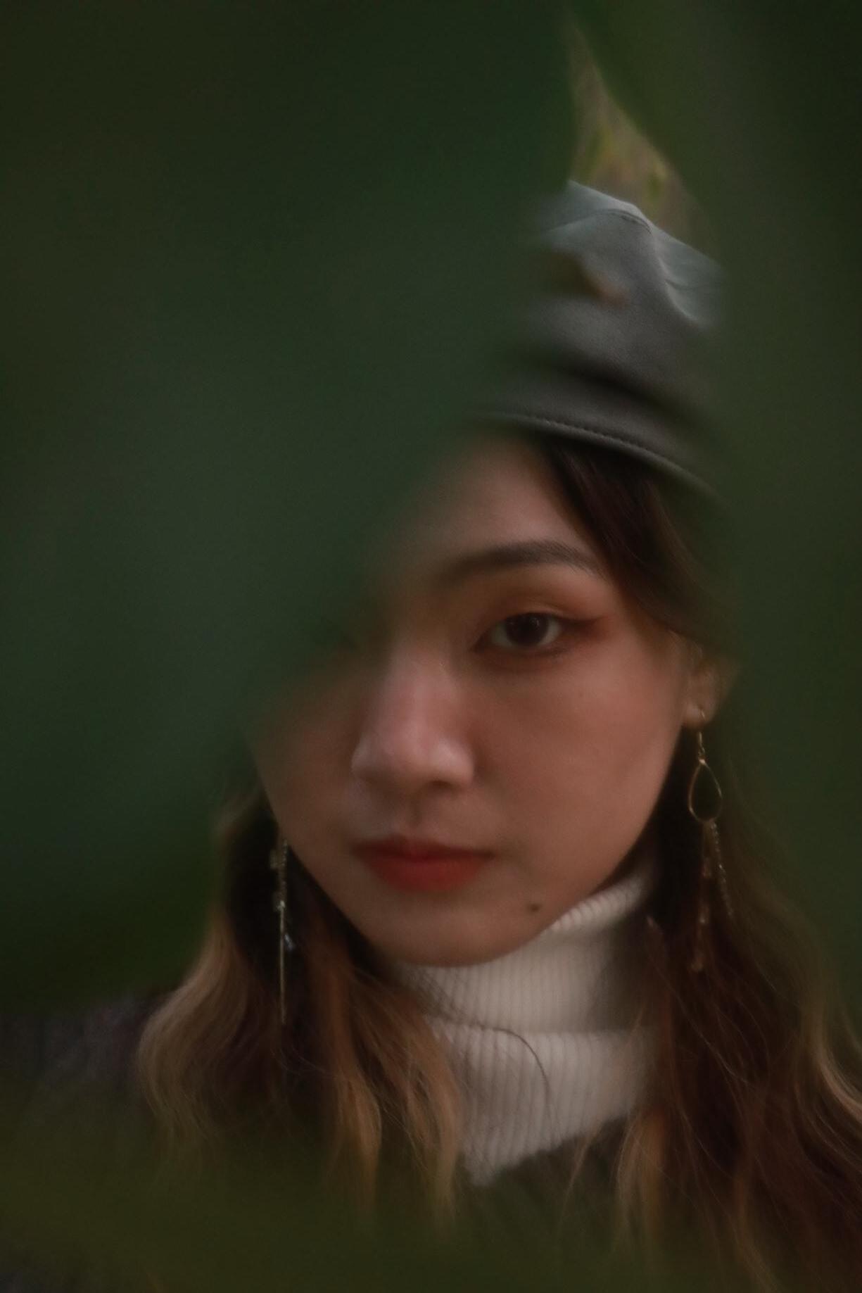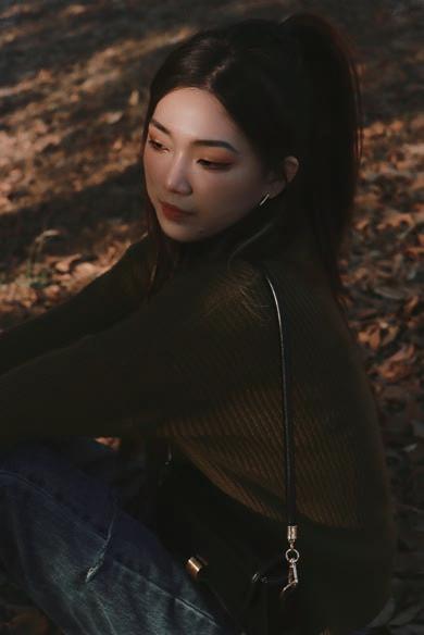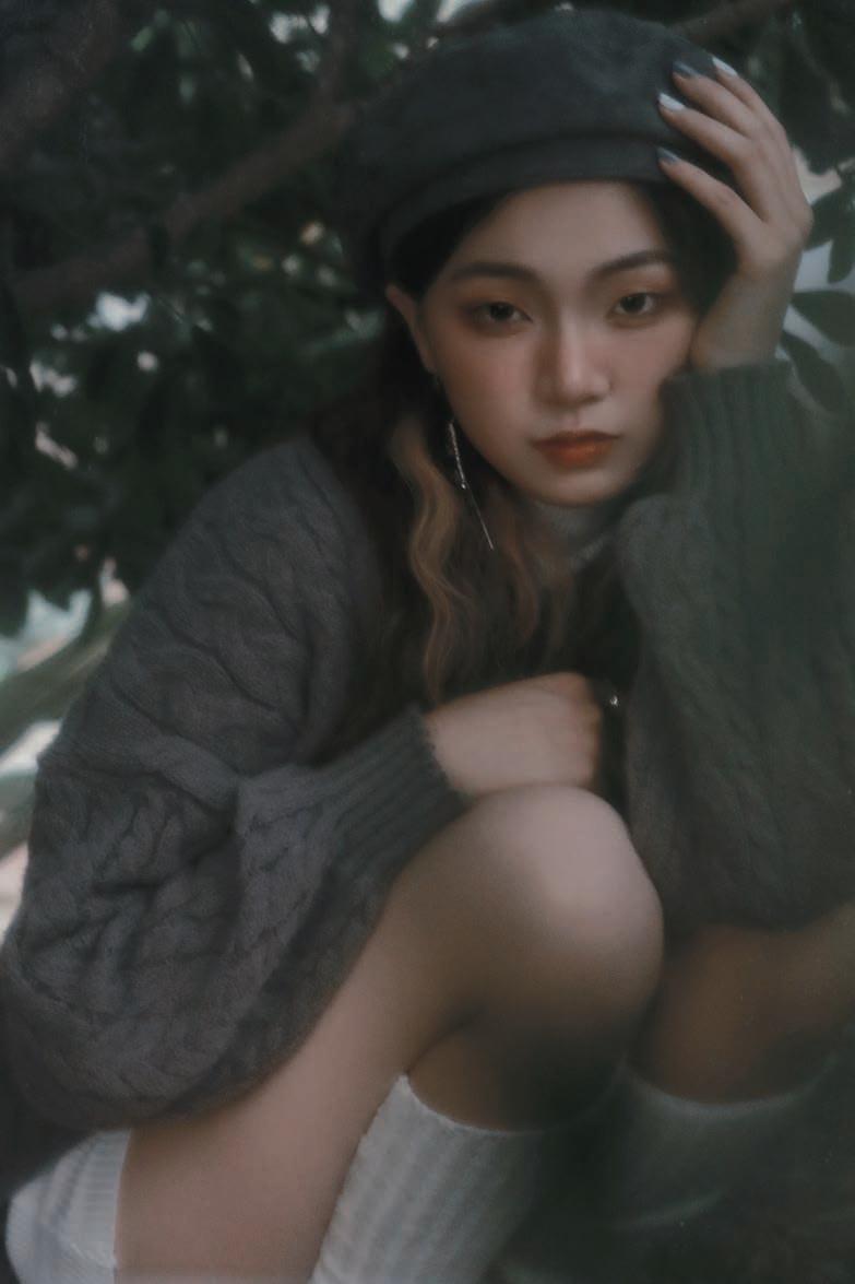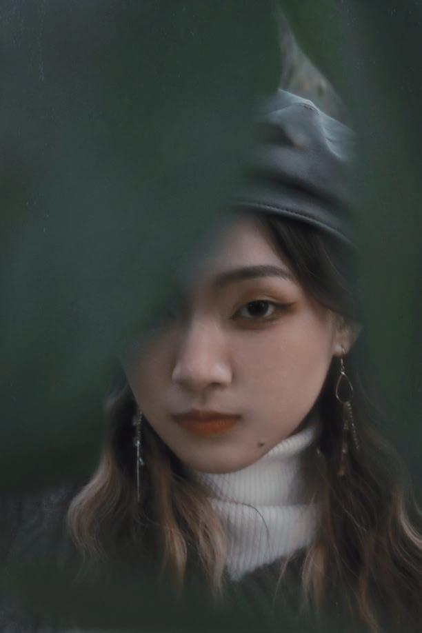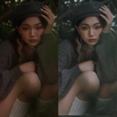 液化主要修飾下半臉,往內縮並調整下顎線輪廓以 及修飾手臂線條,人物膚色調至冷白色,背景色將 綠色調至帶冷調的暗綠色,使畫面更有質感,整體 呈現法式優雅風。