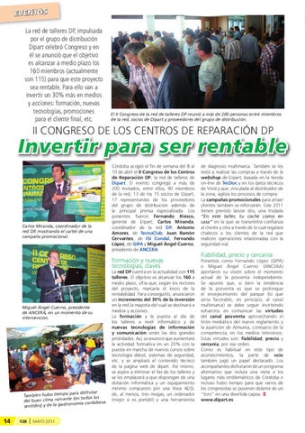 eventos La red de talleres DP, impulsada por el grupo de distribución Dipart celebró Congreso y en él se anunció que el objetivo es alcanzar a medio plazo los 160 miembros (actualmente son 115) para que este proyecto sea rentable. Para ello van a invertir un 30% más en medios y acciones: formación, nuevas tecnologías, promociones para el cliente final, etc.