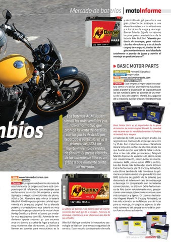 en baterías de moto que se dirigen a todos los segmentos al disponer de amperajes de entre 1 y 35 Ah. Con el objetivo de ofrecer la batería ideal a todos los perfiles de clientes, desde los que buscan precio, una batería fiable o duradera o las más altas prestaciones, Magneti Marelli dispone de variantes de plomo-ácido con mantenimiento, plomo-ácido sin mantenimiento, AGM, plomo-calcio MMX o de litio. Las dos líneas más destacadas son la Lithium Extra-Performance y la FA (Factory Activated), esta última también la más novedosa. La primera se presenta como una gama de litio con BMS (sistema de gestión de la batería) que desconecta el sistema en caso de sobrecarga o descarga. En comparación con las baterías convencionales, las Lithium Extra-Performance de litio duran notablemente más, proporcionan una mayor potencia de arranque y son más compactas y ligeras. En cuanto a las baterías Magneti Marelli FA (Factory Activated), ya han sido activadas en las fábricas y están listas para su montaje, sin cargas ni esperas. La elevada cobertura del parque es otro de los puntos fuertes de estas baterías.