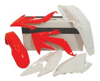 Concretando, a través de un buen elenco de marcas pone a disposición del segmento de la moto de campo y trail kits de plástica completos, aletines de radiador, guardabarros delanteros y traseros, faldones cubre amortiguador, paletas quitabarros, paneles laterales para el radiador, paneles laterales traseros, placas portanúmeros delanteras y laterales, tapas de caja de filtro, portafaros, deflectores, carenados, rejillas y un amplio elenco de protectores (chasis, leva de freno, disco, horquilla, radiador, etc.).
