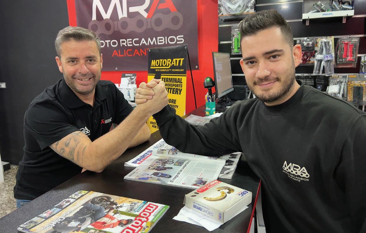 Eloy Antolínez y Enrique “Kike” Martín son los dos socios que dan alma y continuidad a Moto Recambios Alicante (MRA). Además de ellos, la plantilla se completa con otros tres profesionales en diferentes áreas de la empresa. Eloy, que ahora tiene 43 años, protagoniza esta entrevista. Empezó a trabajar de adolescente haciendo lo mismo que ahora, y además en el mismo barrio, a menos de cinco minutos andando de la tienda que ahora regentan y que abrió en agosto de 2020. ¿Por qué no se han movido? El arraigo nos va creando una dulce zona de confort en forma de vecinos saludados, camareros que ya saben cómo tomas el café cuando entras por la puerta… y tampoco apetece alejarse cuando hay hasta siete talleres de la lista clientelar a tiro de piedra.