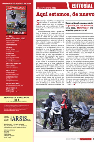 i creías que MotoTaller se había perdido para siempre en aquel hueco al que van las revistas que dejan de publicarse, tenemos una buena noticia para ti: aquí estamos, de nuevo. De muy nuevo. De estreno total, vamos. Verás que excepto el nombre y la cabecera, todo lo demás es de nuevo cuño en esta revista que ahora tienes en tus manos. La razón es simple: los que ahora hacemos MotoTaller somos otros, y no unos cualquiera. Nuestra editorial, C.E.I. Arsis, lleva más de 30 años editando revistas especializadas en la posventa del automóvil en España. Mundo Recambio y Taller es la revista de referencia en el panorama de la fabricación, distribución y venta de recambios para el automóvil y nació en 1980. ElectroCar, por su parte, es una revista eminentemente técnica pensada para el taller electromecánico y de diagnosis del automóvil y que pusimos en marcha en 1999. MRyT.es es el portal en internet que da cobertura inmediata a todo lo que sucede en la posventa del automóvil en nuestro país, y lo viene haciendo de forma ininterrumpida desde 2008. Y ahora, MotoTaller se muda a nuestra casa para seguir siendo la revista de referencia en posventa de la moto en España, ahora que en marzo se cumplirán ya sus 21 años de vida. Aquí sentimos la pasión por las motos desde ñajos, así que MotoTaller es nuestro destino natural. Desde que un vecino del pueblo me dejó una Merlin 50 de trial y me la puse por sombrero a la primera que solté el embrague, he sentido atracción por circular sobre dos ruedas con un escape tras