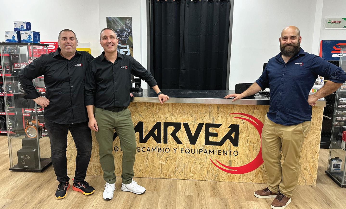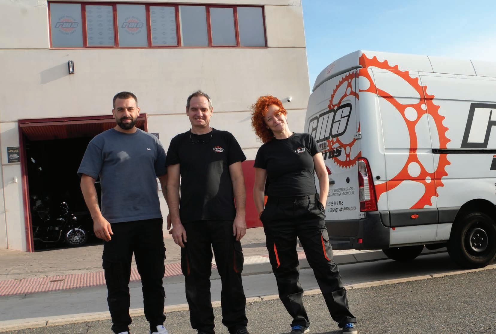 Tres piezas clave en una colaboración basada en confianza, pasión por la moto y atención al detalle: Óscar Agudo y Tatiana Pernía (RMS Motos) y Rubén Ales, comercial de zona de Euromoto85 (a la izquierda en la imagen).