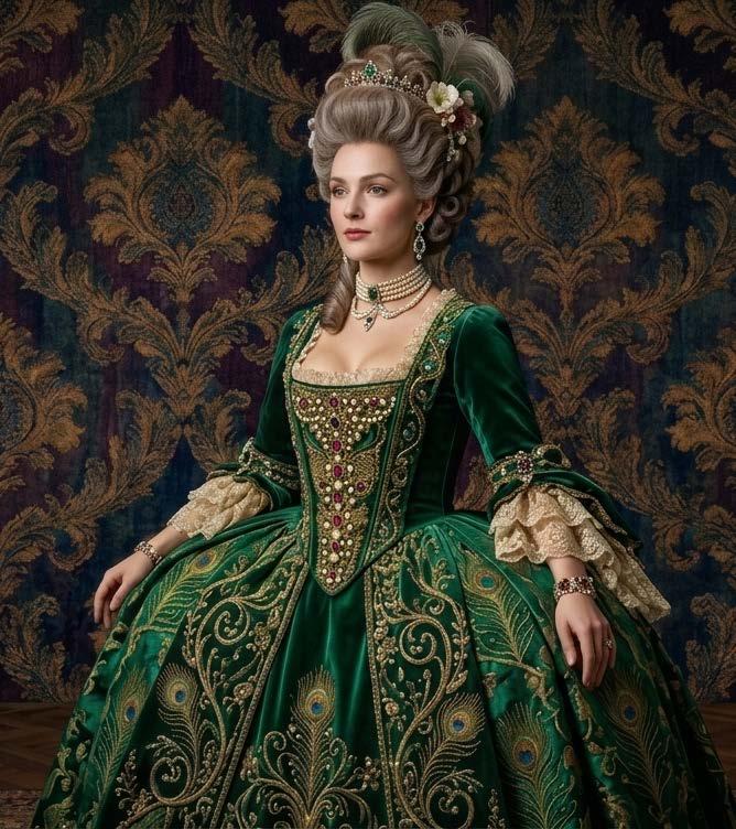 In the 17th century, France became the fashion center of Europe. Queens and princesses wore voluminous gowns with underwires to in ate the skirts, adorned with lace, feathers, and pearls. Each gown told a story of royal extravagance, and gold and purple hues signi ed power and wealth. Some of these gowns even required servants to assist the wearer, adding to their opulence and extravagance.