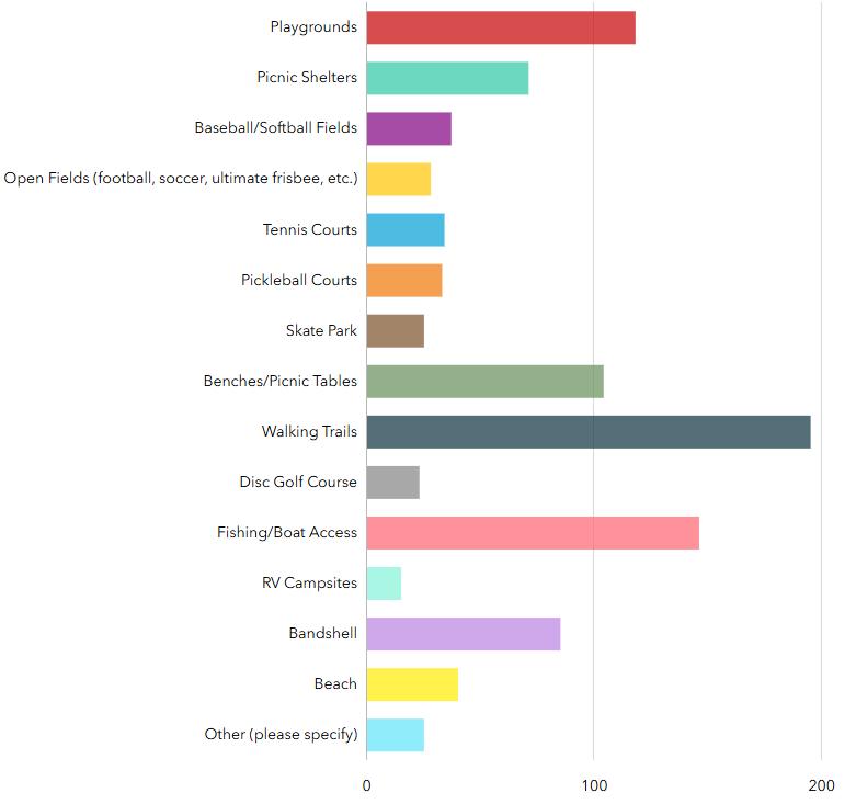 • Swimmer’s itch was named as a primary barrier to utilizing Amery’s existing water bodies for swimming and boating. Splash pads, community pools, swimming beaches, and boat rentals were – by far –the most requested amenities across all engagement methods.