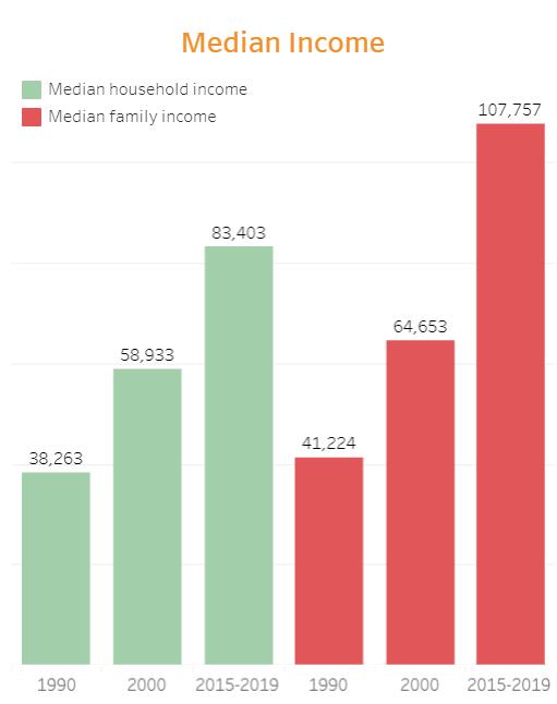 The chart below shows the distribution by 5 year age cohorts of Norwalk’s populace. The chart shows a healthy distribution across the age ranges and gender that usually include working age adults and their families. A good distribution of both young and established families supports a community’s ability to continue supporting existing businesses, schools and organizations. Additional economic and household growth can also be support by a healthy distribution of ages and genders.