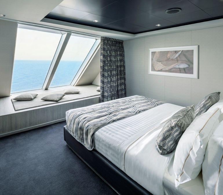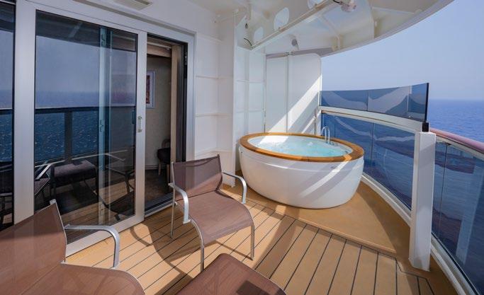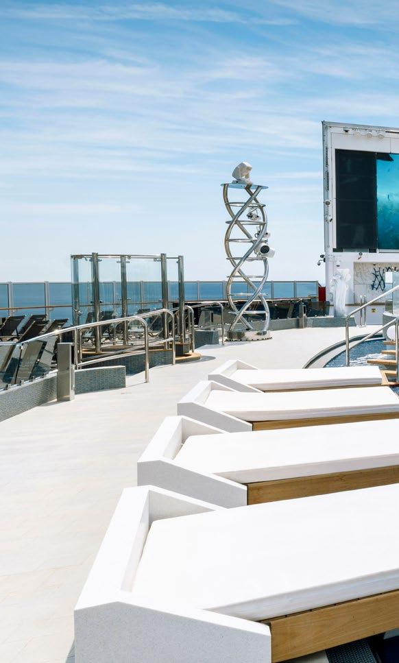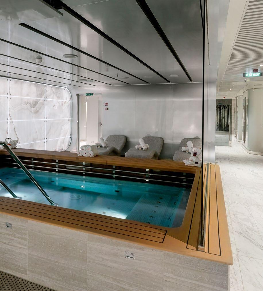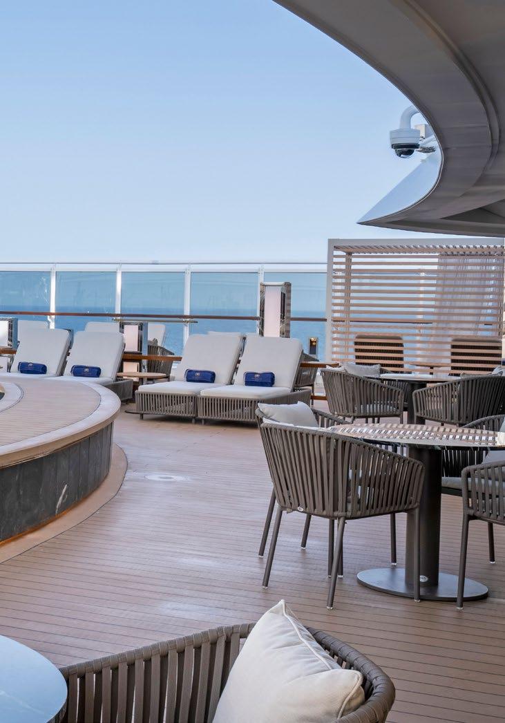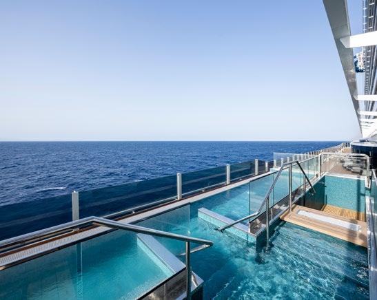 di una moderna nave da crociera. La piscina privata e il solarium sono i più grandi di sempre, con anche una vasca idromassaggio fronte mare e una jacuzzi a poppa.