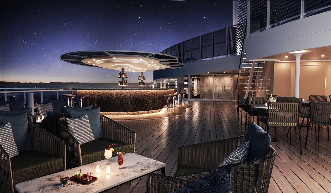 Ma non finisce qui, nell'area sono presenti anche un cocktail bar di benvenuto e un lounge dopo cena. Tutti potranno godere del nuovo Cocktail Bar all'aperto Rooftop che offre una vista a 360° dall'alto del ponte 16 e gli ospiti di Esperienza Aurea di un ristorante dedicato.