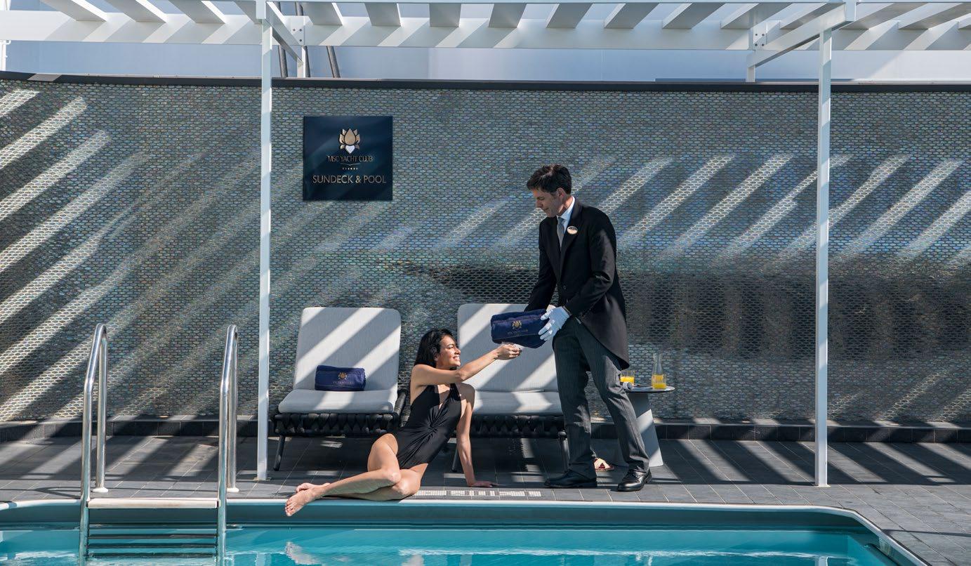 Au MSC Yacht Club, une équipe dévouée est à votre disposition 24 h/24 pour faire de chacun de vos souhaits sa priorité. Qu'il s'agisse d'un majordome qui vous escorte lors de l'embarquement prioritaire avant de défaire vos bagages, d'un concierge qui organise une excursion sur mesure, d'un chef qui vous prépare une cuisine raffinée ou d'un sommelier qui choisit le vin* idéal pour le dîner, vous serez choyé à chaque instant. L'équipe du MSC Yacht Club aura à cœur d'anticiper vos moindres besoins dès votre arrivée pour vous permettre de vous relaxer sans qu'aucun souci ne vienne ternir votre horizon.