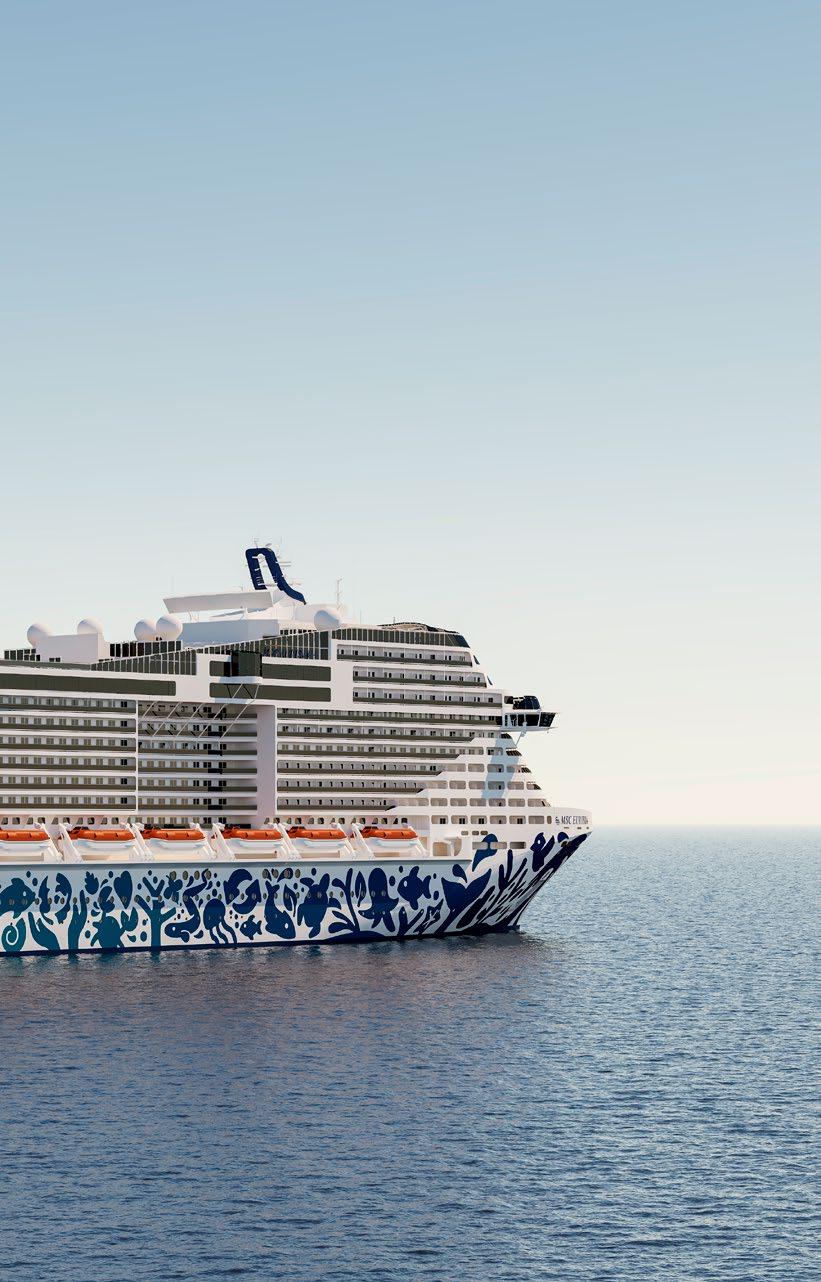 obra de arte utiliza una paleta de colores inspirada en el océano para representar el compromiso de MSC Cruceros con el medio ambiente y el profundo respeto por los océanos. El colorido diseño del casco es el preludio de una experiencia igualmente vibrante para los pasajeros a bordo, construida en torno a
