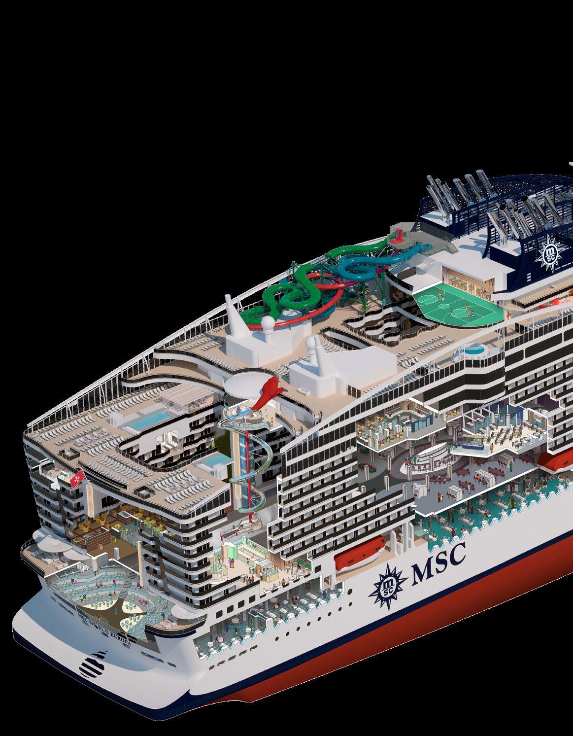 Exciting new spaces include the exclusiveto- MSC LEGO ® Room , open to kids and parents, offering never-ending fun with LEGO bricks, and The Studio, a high-tech room packed with over 21 consoles, 7 VR stations and more than 50 video games. Entertainment meets education in the MSC Foundation , with kids-tailored projects with the aim of building awareness on environmentally related topics.