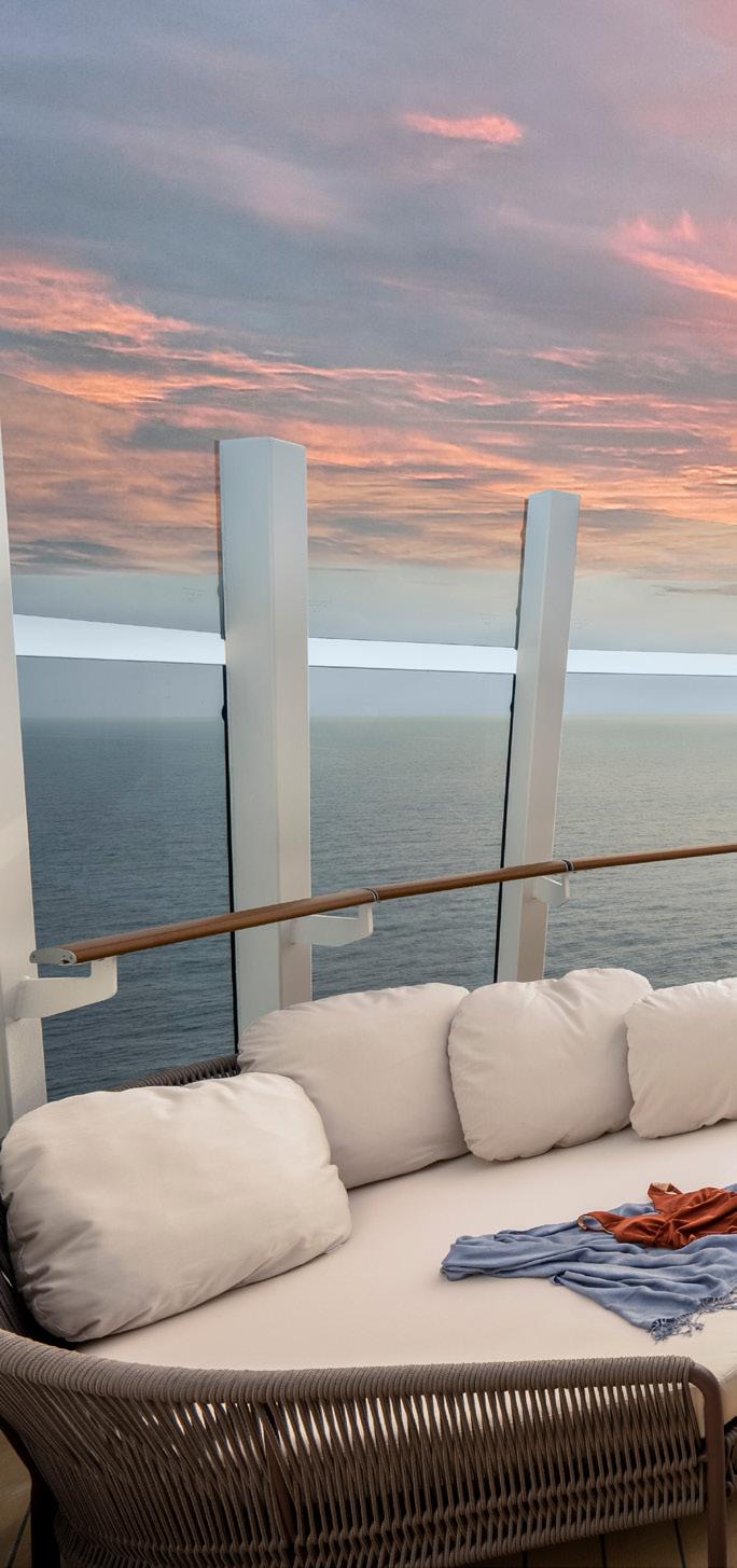 from a pillow menu. Then there’s an exclusive panoramic lounge with complimentary gourmet treats and drinks, complimentary access to the Thermal Suite in the MSC Aurea SPA and a sun deck with pool and whirlpools that offers the ultimate in privacy, being on the very top deck where it can’t be overlooked.