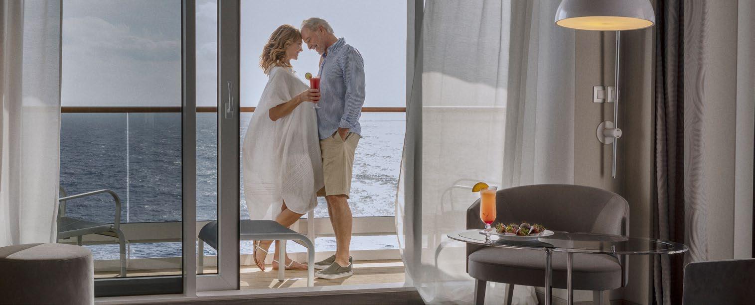 Willkommen an Bord! Öffnen Sie die Tür Ihrer komfortablen Balkonkabine, genießen Sie den atemberaubenden Ausblick und lauschen Sie dem Rauschen des Meeres.