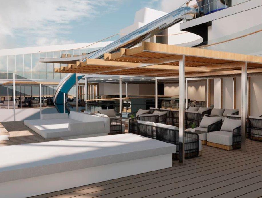 She offers distinct neighborhoods, each with its own atmosphere and brand-new experiences –from a tranquil zen zone for to a lively partially open promenade with entertainment, bars, shops and luxury boutiques, followed by a family zone that houses all the kids’ facilities. She has a state-of-the-art architectural 11-deck dry slide