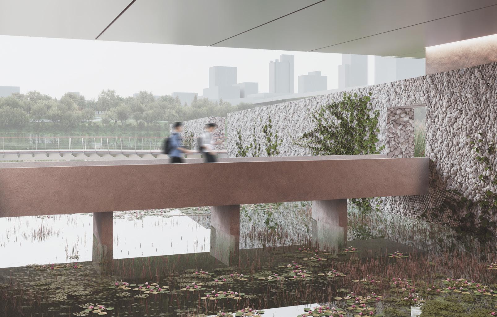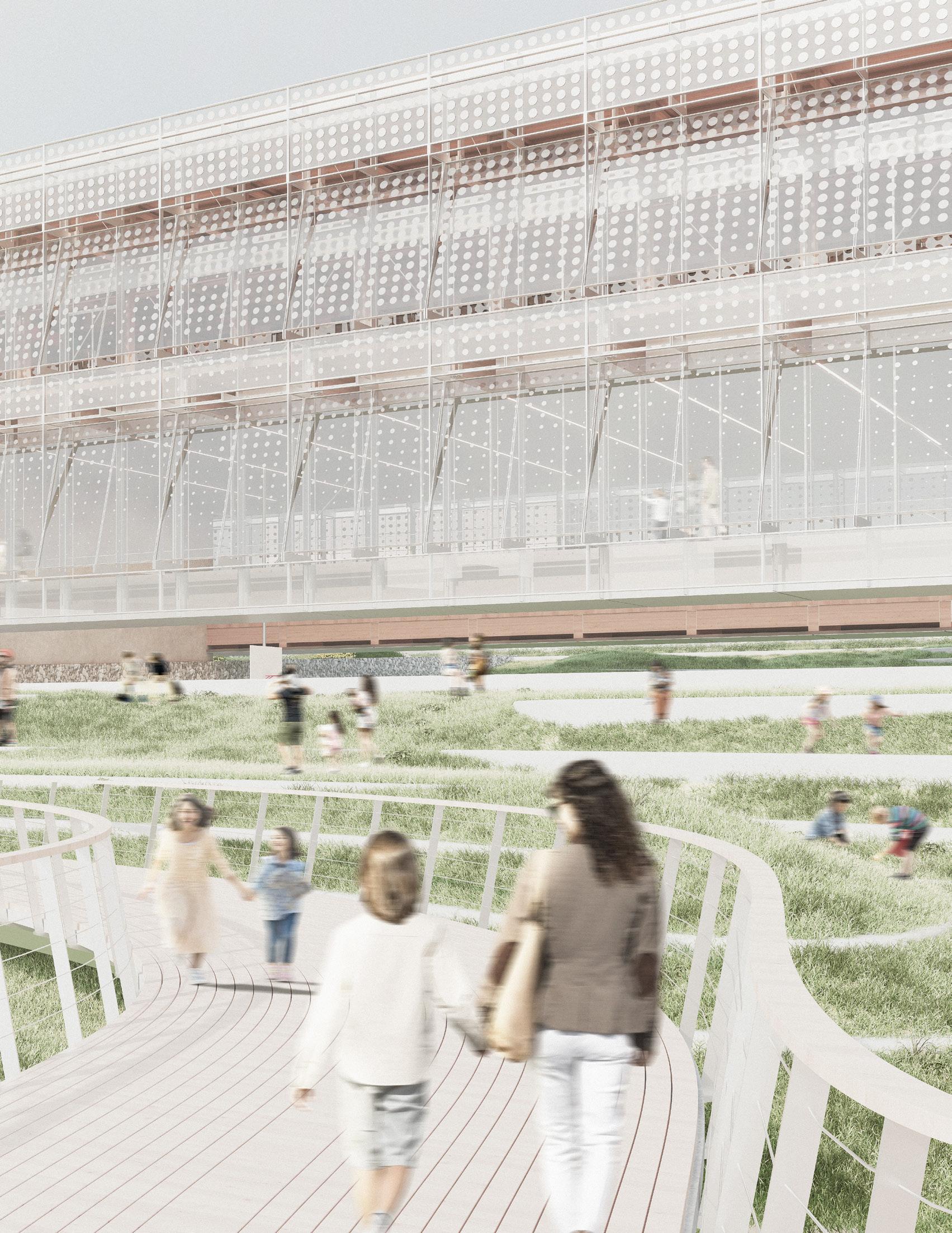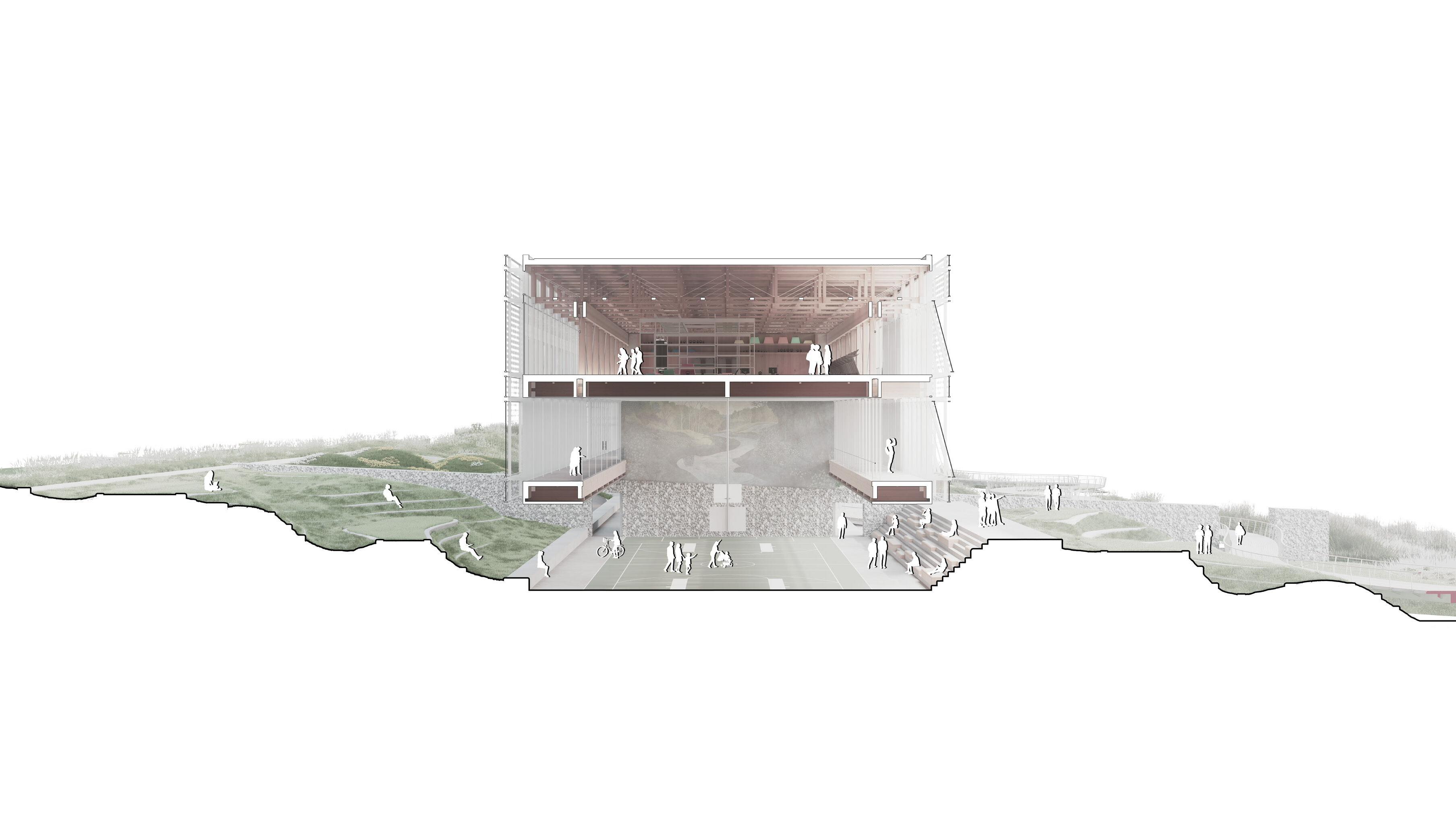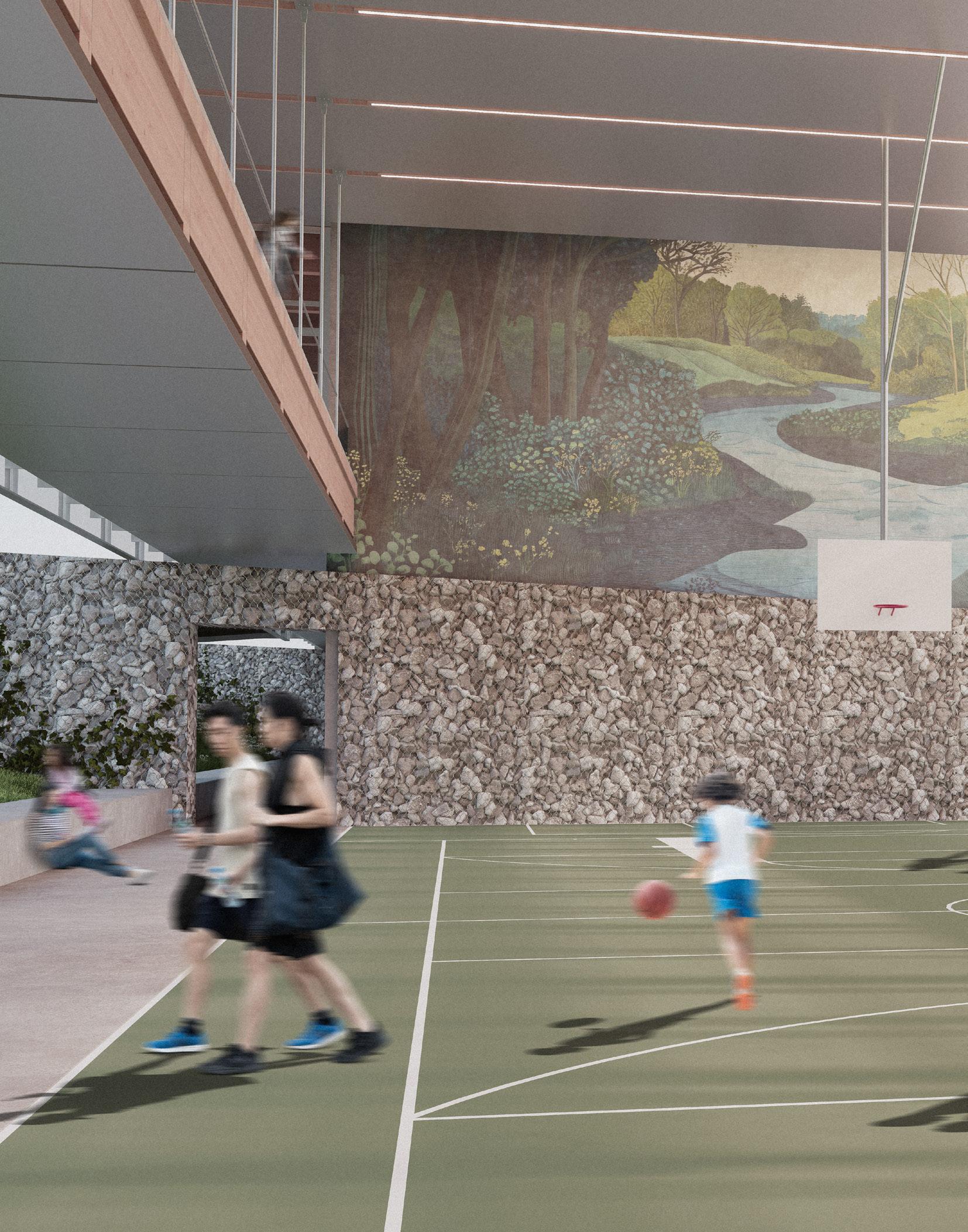 This Sports and Leisure Complex in North Little Rock opens traditionally closed-off recreation facilities to the public realm. Sprawling sports courts lie beneath a “floating bar” housing the lobby, locker rooms, fitness center, and café. By elevating these core amenities, the design invites public interaction with formerly exclusive spaces while creating a distinctive architectural presence. The site is divided into park zones featuring varied ground-manipulation strategies— from sunken gardens to raised terraces—offering diverse recreational options and social hubs. This fosters an inclusive, dynamic environment that welcomes continuous community engagement.