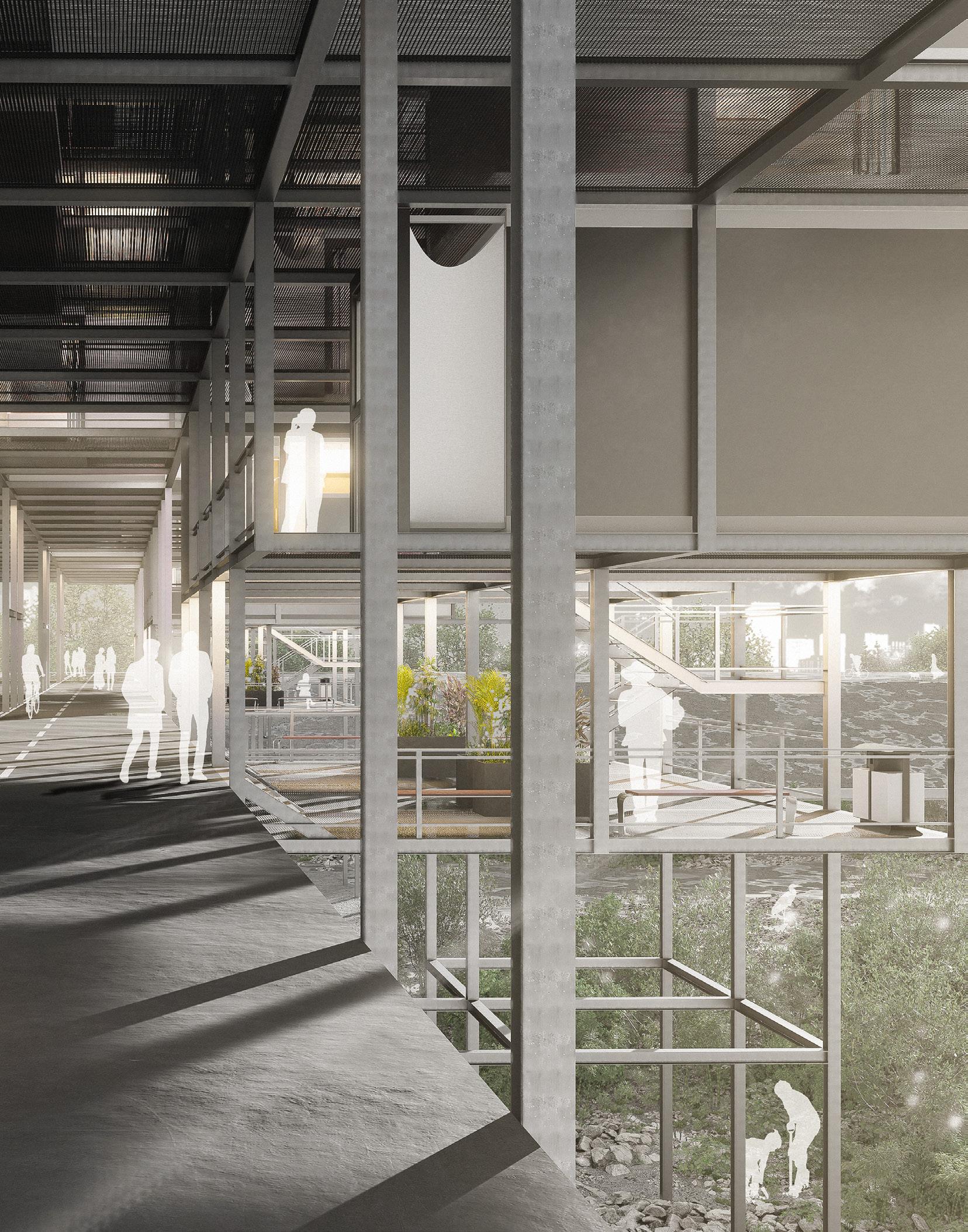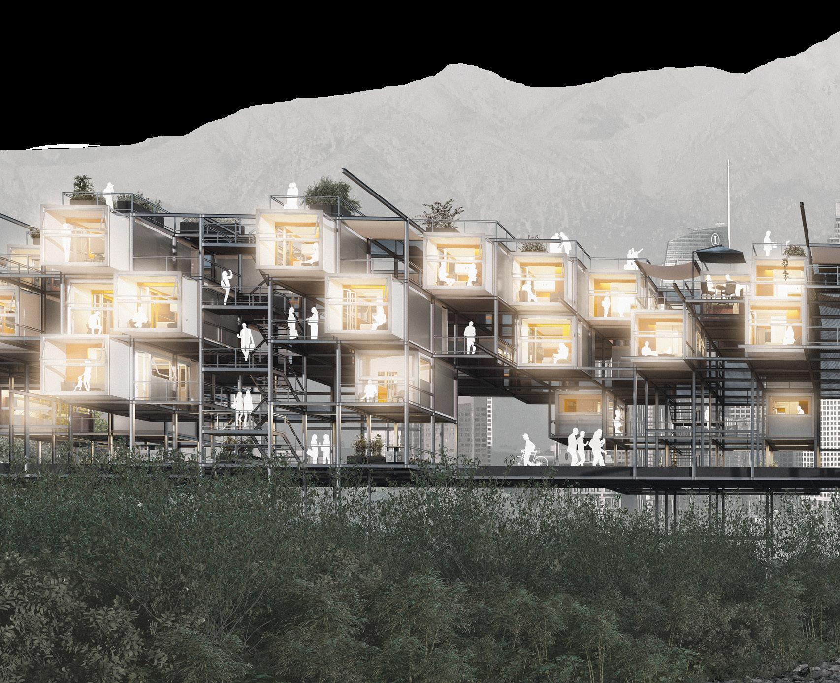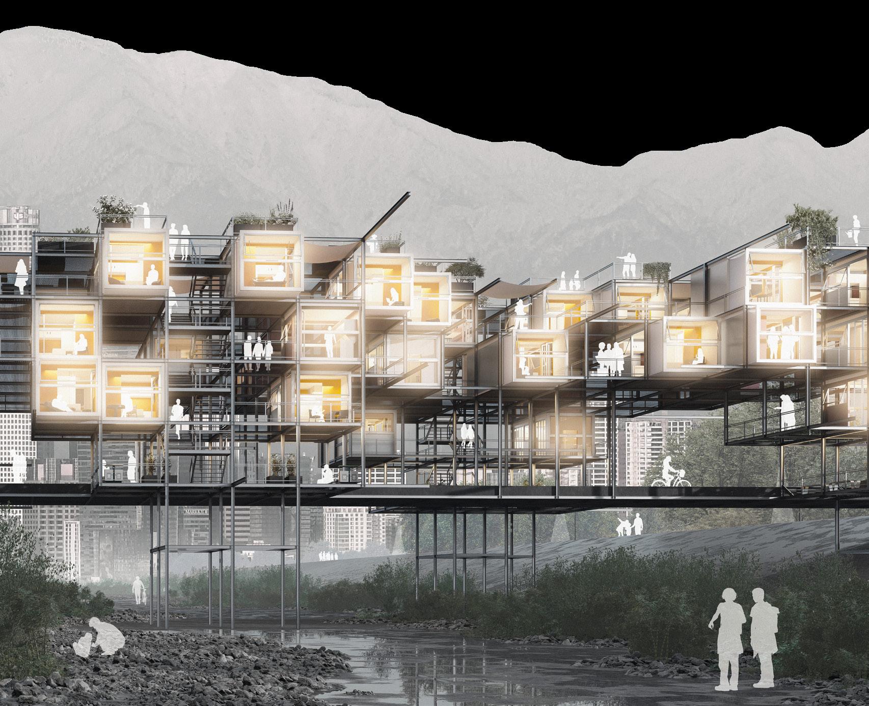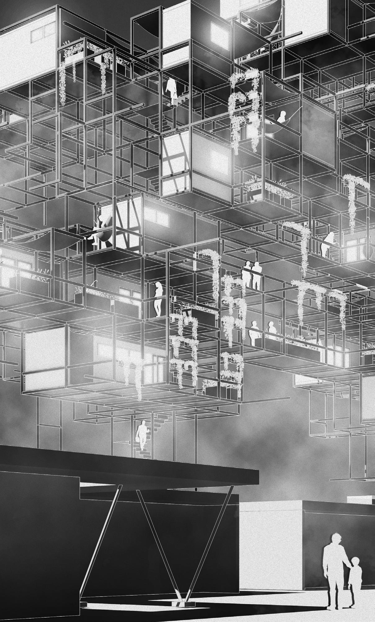 This elevated community merges housing, public space, and urban connectivity through a flexible steel framework spanning the LA River. Each bay operates as a self-contained micro-community, integrating prefabricated modular units with adjustable living spaces, private balconies, and shared amenities for adaptability and efficiency. A central circulation core provides direct access between the pedestrian corridor—where breakout plazas, market stalls, and green spaces create a walkable, dynamic public realm—and the residential units above. Suspended infrastructure become active extensions of the city, reconnecting divided neighborhoods and ensuring a resilient urban ecosystem. By maintaining human-scaled environments while supporting expansion, these adaptable bays generate new real estate opportunities in underutilized spaces, fostering community engagement within a larger bridge network.