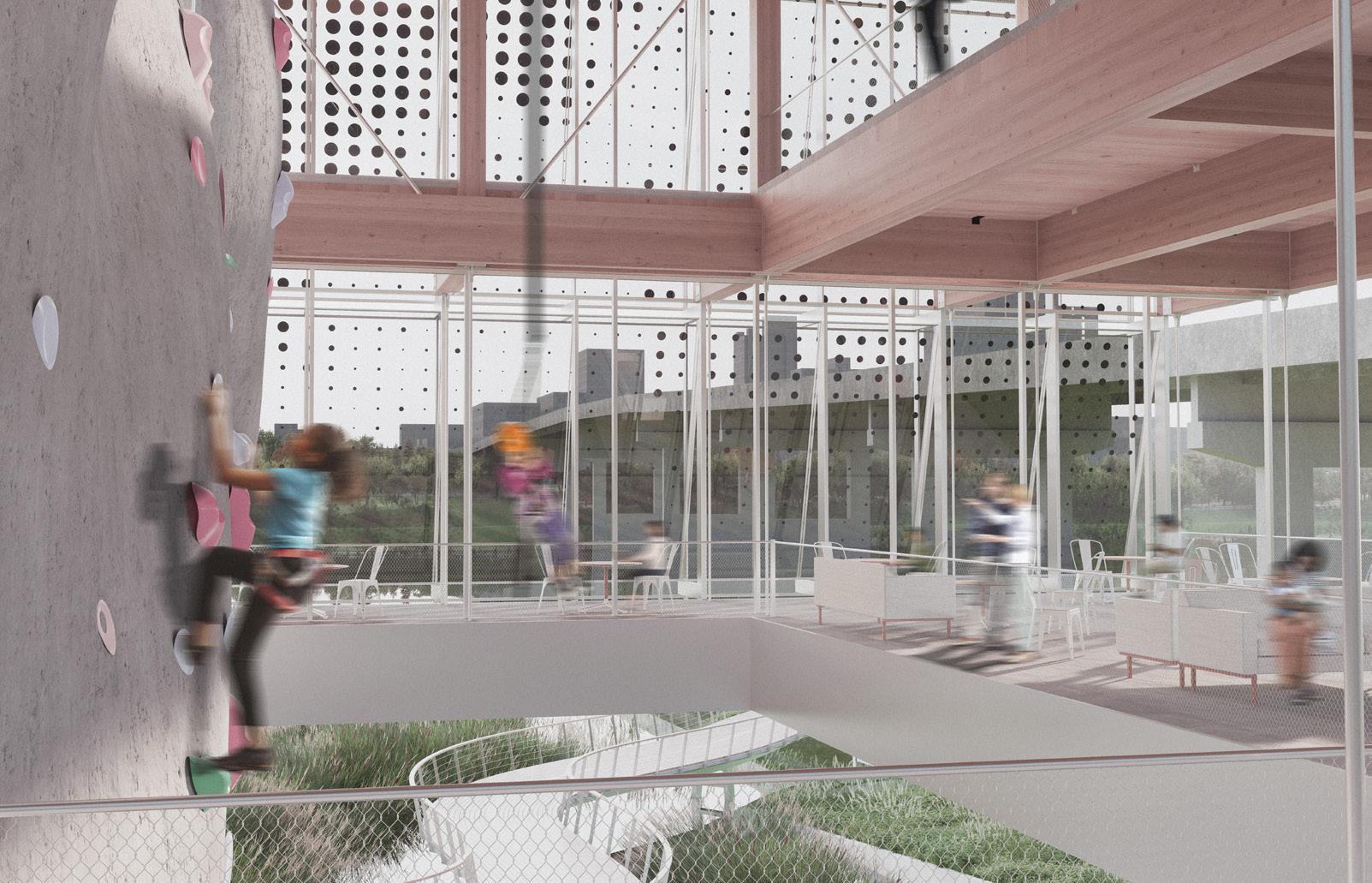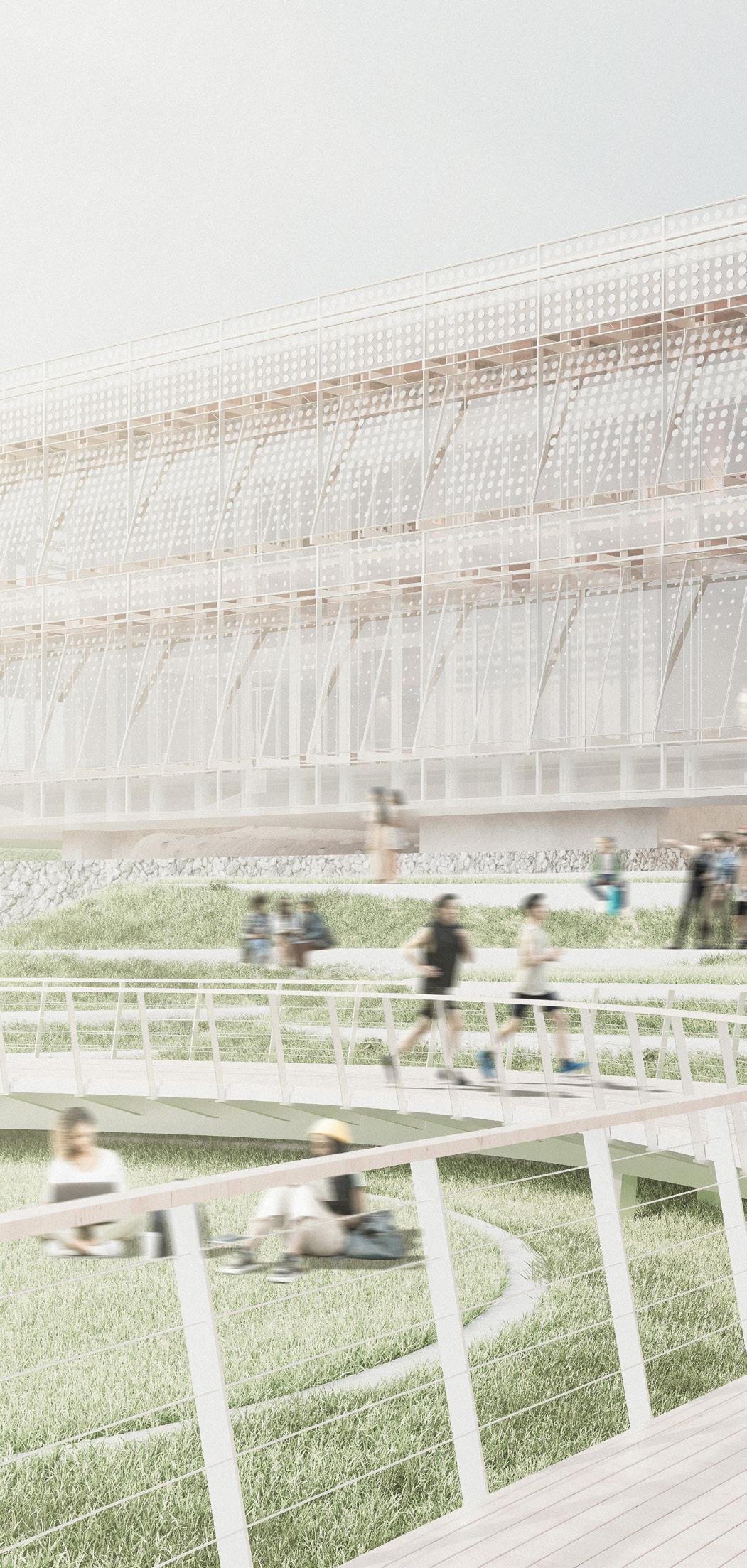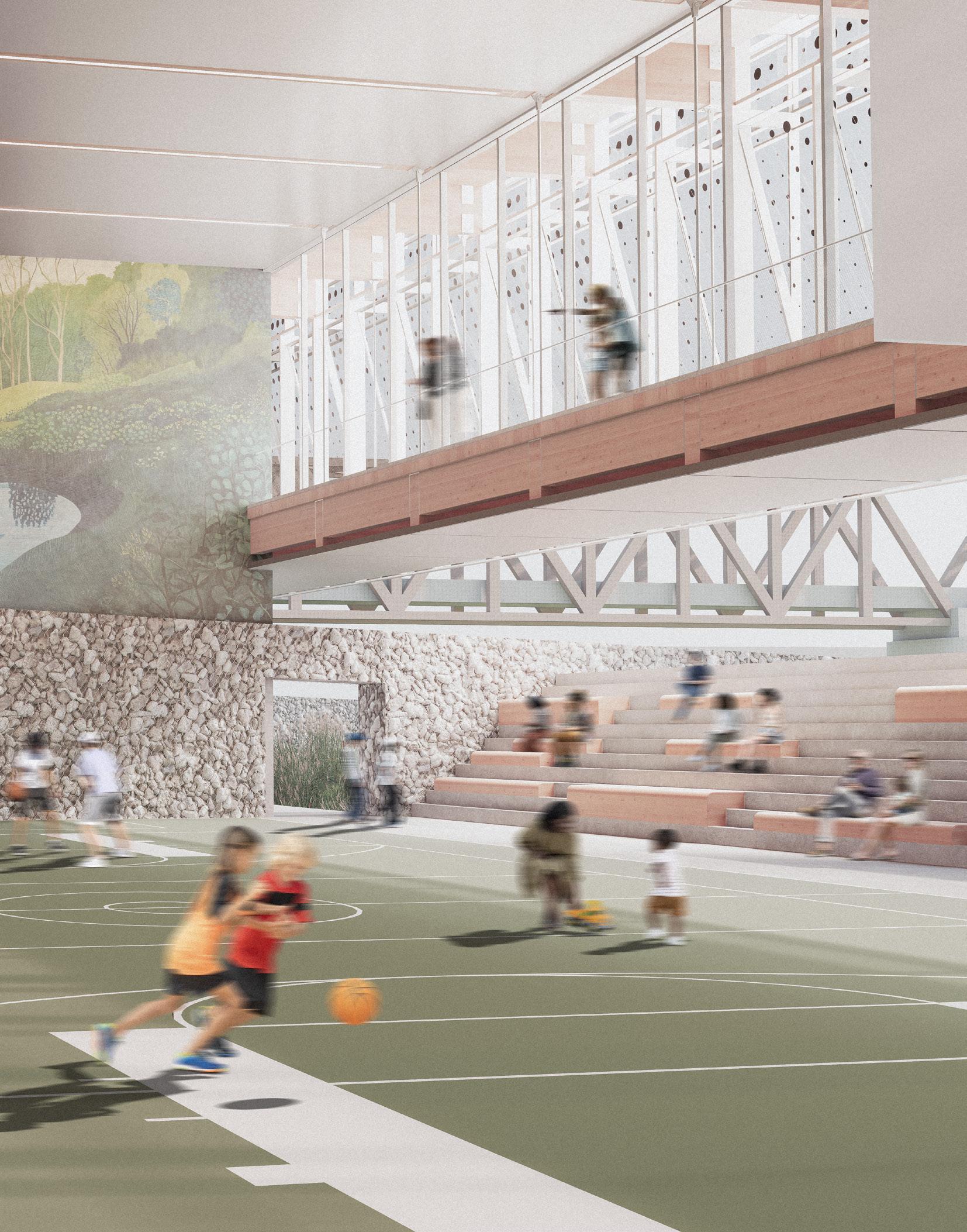 Sports and Leisure Complex reclaims recreation by opening restricted amenities to the public. Using a hybrid concrete and mass timber system, it achieves balanced shading, ventilation, and transparency while integrating passive environmental strategies. Protected public spaces create an inviting enclosure that fosters interiorto-exterior interaction and a community experience.