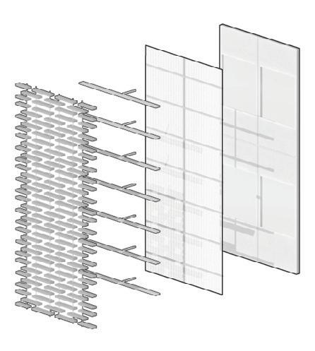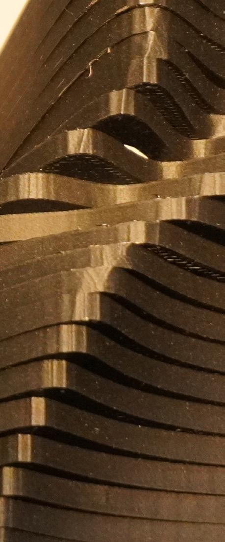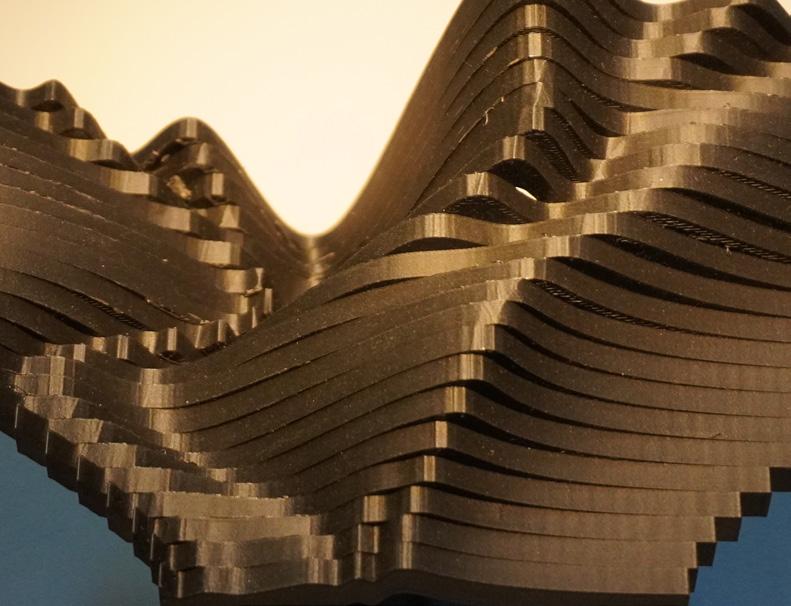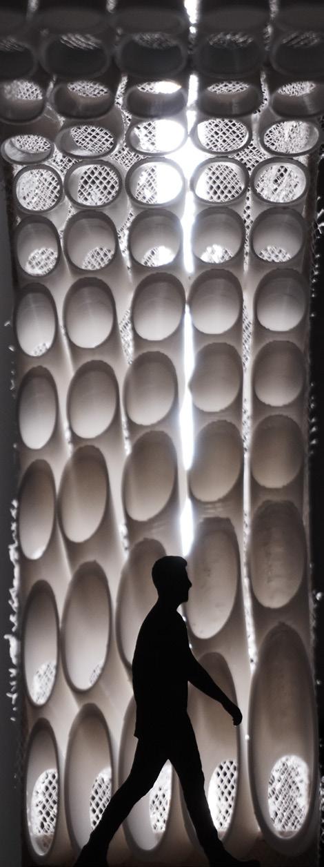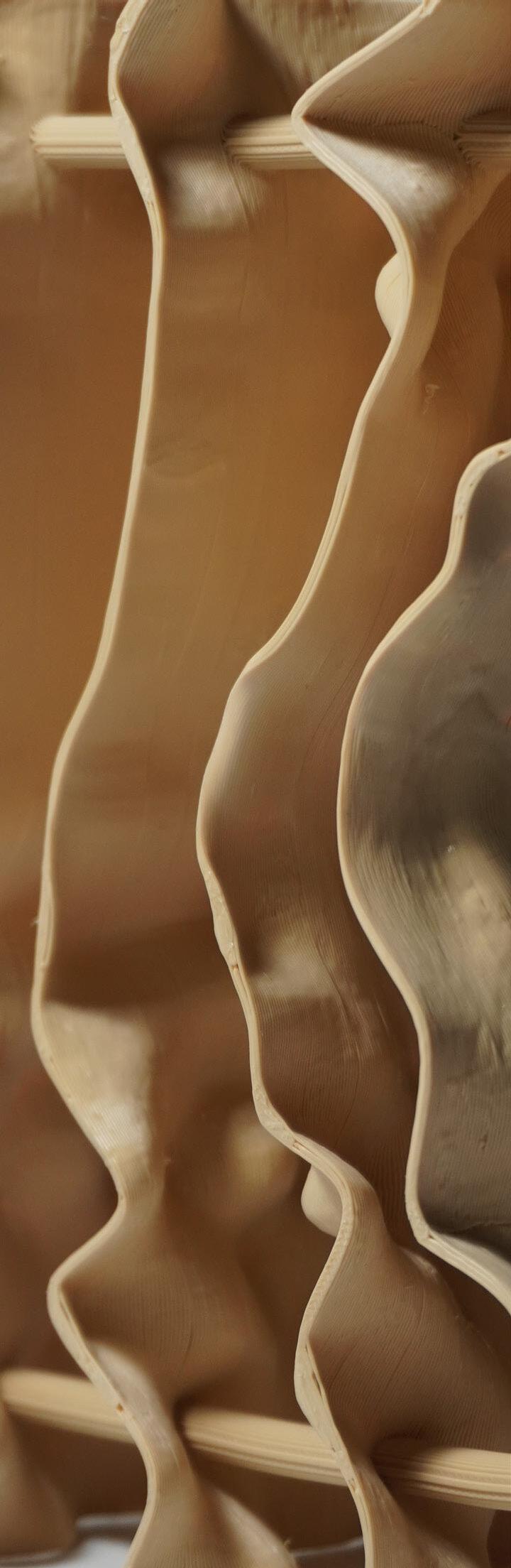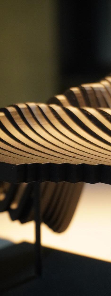 Exploring a reconfigurable model that evolves alongside new ideas, using interlocking components to replace the main curved surface without permanent adhesives, while a net-like fabric embedded in the 3D-printed layers provides porosity, flexibility, and a fabric-like quality. Two scale variations, along with a removable back plate, shift the spatial experience and enhance light interplay, fostering experimentation with each iteration.