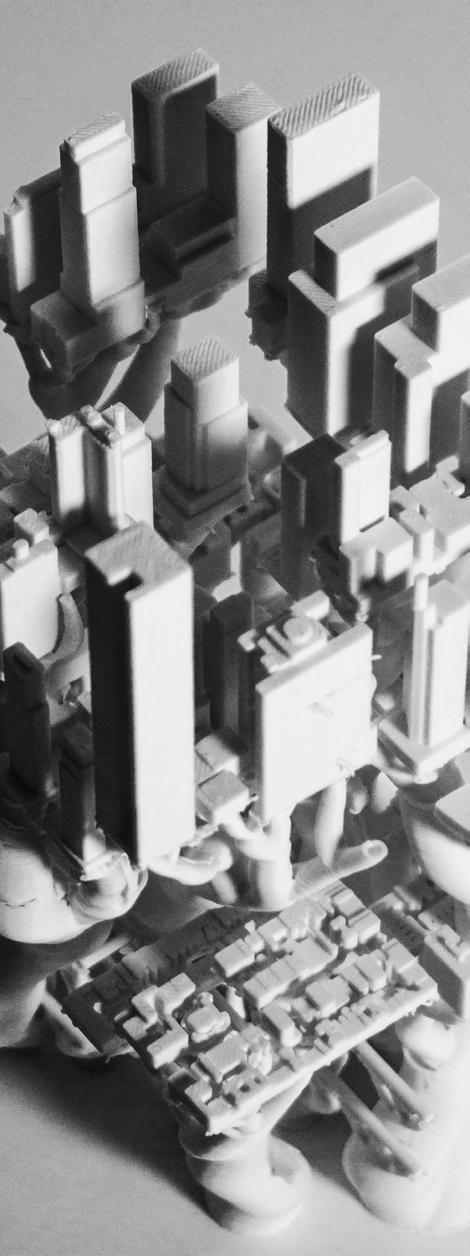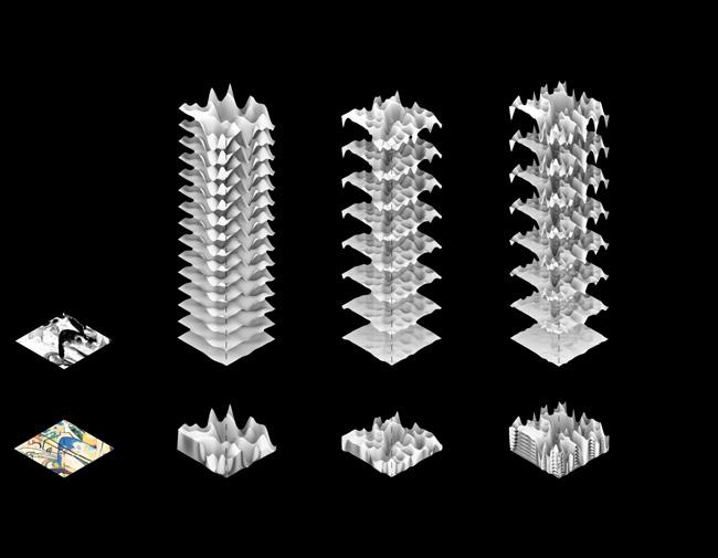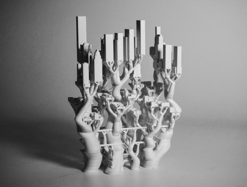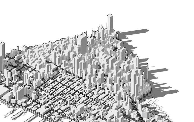This project compiles infrastructural and population density data in Manhattan to produce a theoretical exploded axonometric model of New York City. Building heights correspond to population density, while subway lines indicate usage rates. A generated “tree support” system suspends these elements, emphasizing the city’s interwoven complexity and also illustrates how density is formed and sustained by interconnected networks.