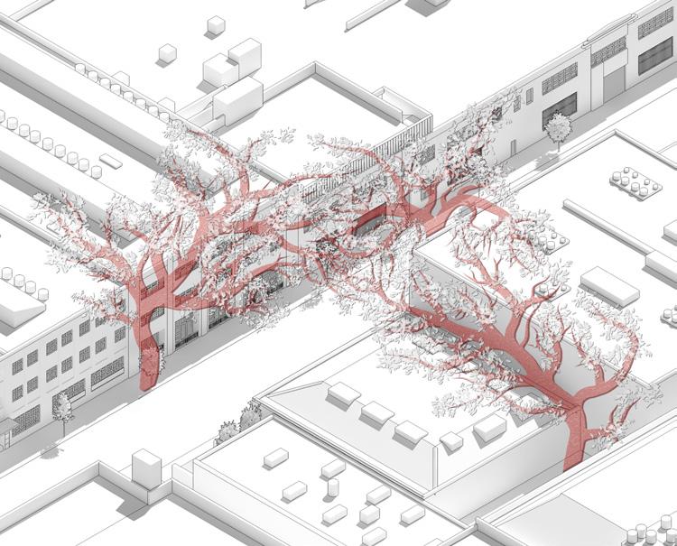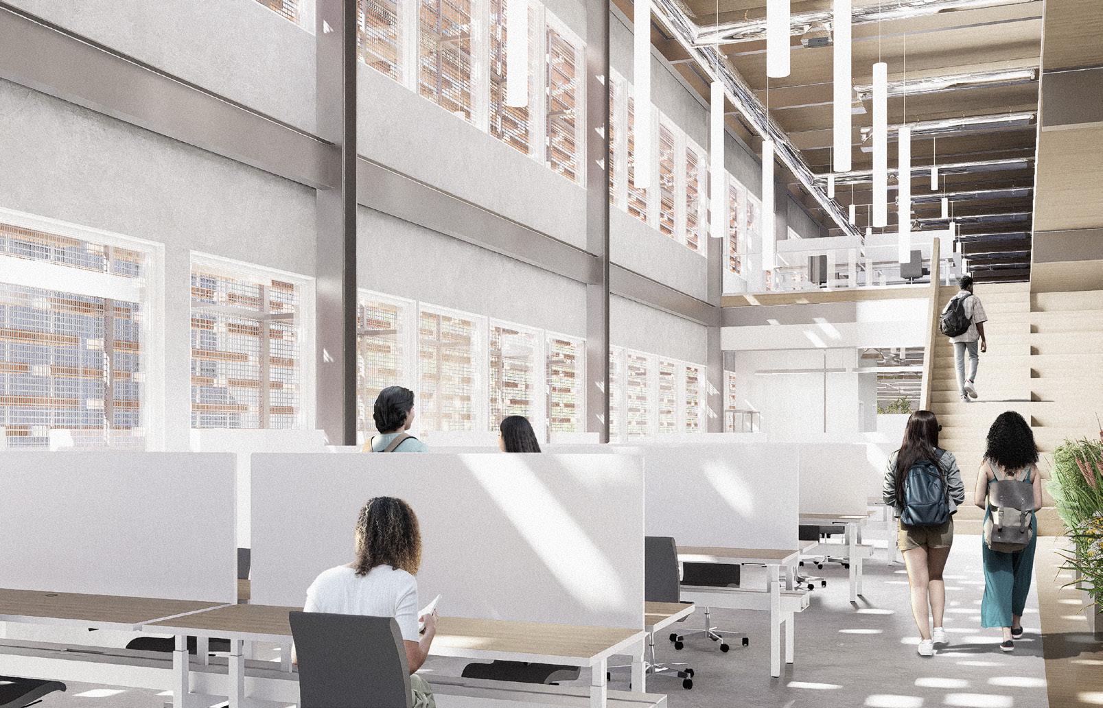 The strategy for this academic facility emphasizes interaction through a strategic circulation system. This layout directly connects various academic spaces, promoting exchanges and collaboration. Circulation paths are designed not just for movement but also as active zones for idea exchange, aligning with the goals of the academic programs. Integrating these routes with communal and research areas helps dissolve traditional disciplinary barriers, fostering a dynamic educational environment where disciplines can learn from one another. This approach creates a learning space that aligns with the urban context and supports the objective of merging practical innovation with education. The design invites continuous and constant interaction, enhancing the educational experience through physical and visual connectivity.