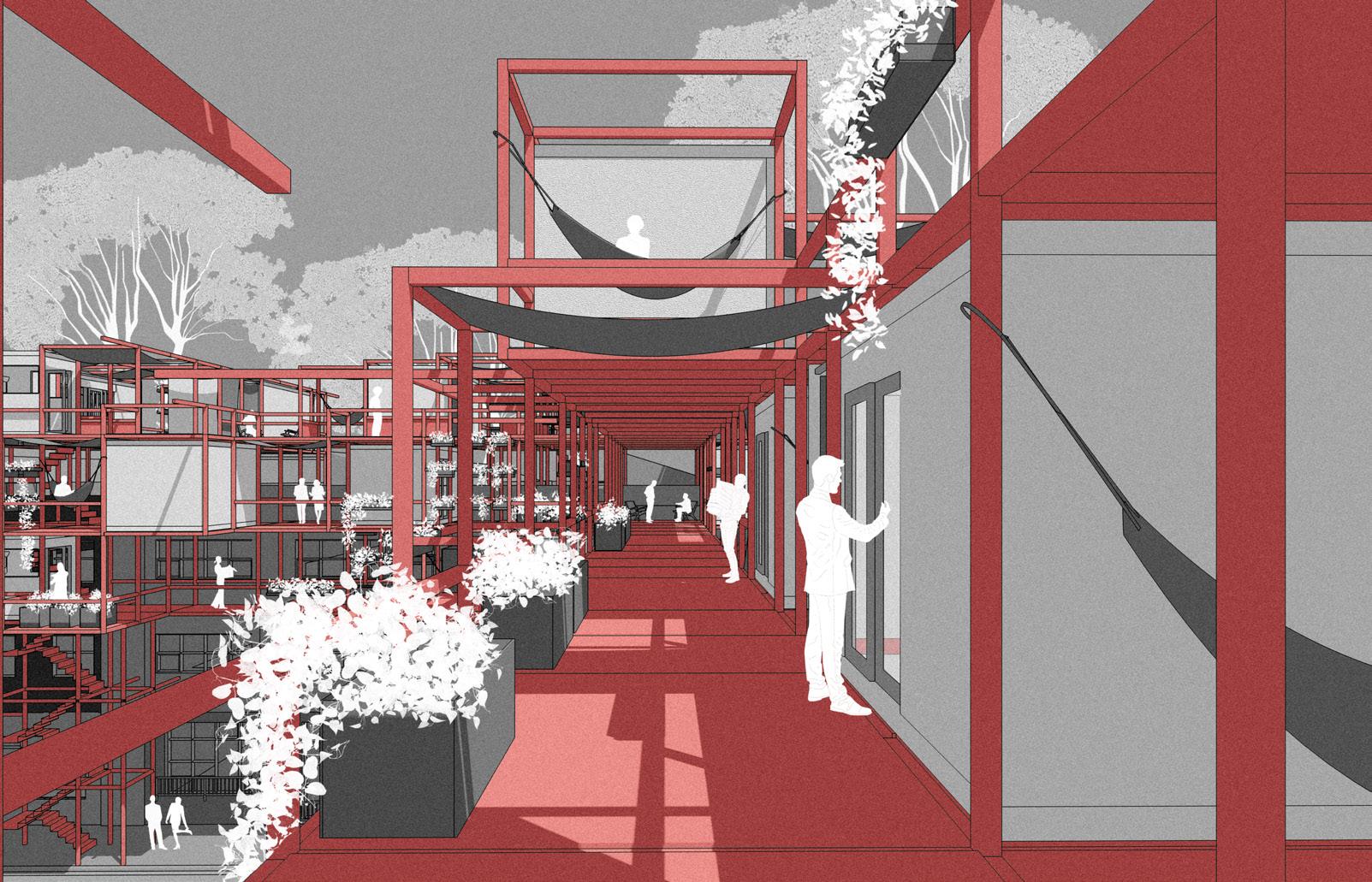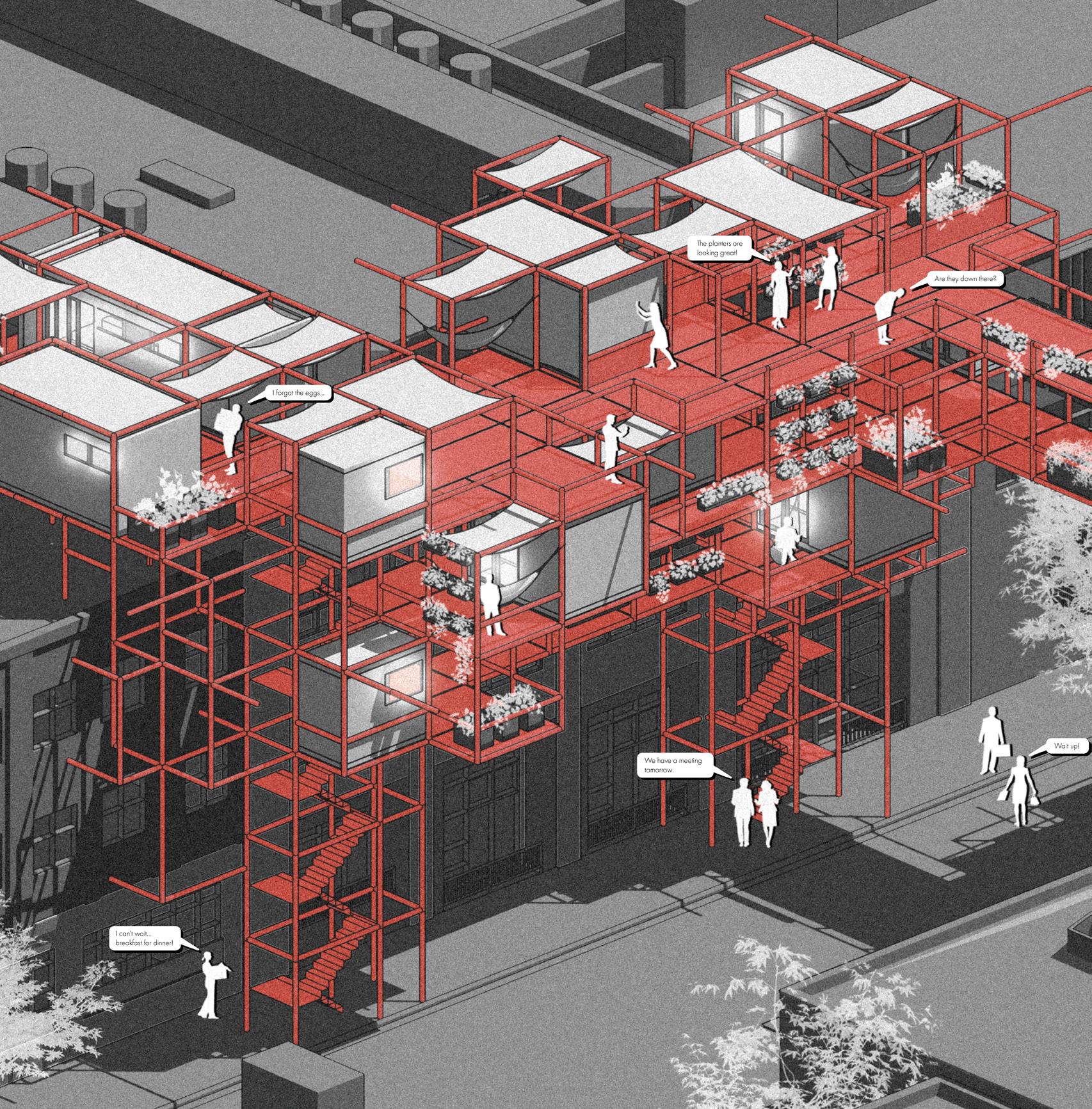 Ephemeral “parasitic” architecture seamlessly extends existing urban infrastructure, forming an inherently adaptable response to shortages. Utilizing modular, easily deployable enclosures, it envisions flexible solutions for diverse contexts, demonstrating how architecture can rapidly address urgent social needs without permanent alterations to the urban fabric.