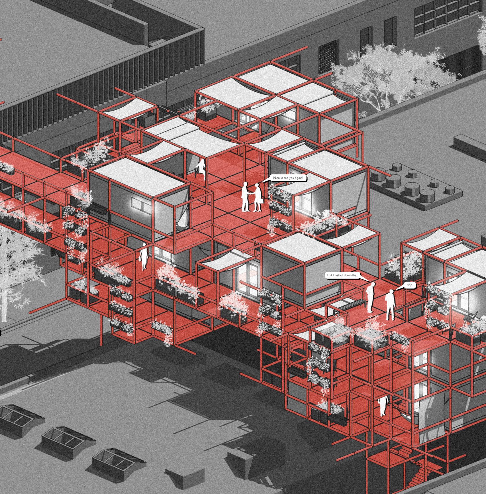 Parasitic architecture reveals its potential by rejecting fixed forms and adapting to existing conditions. It evolves as it attaches to and extends from current structures, its shape continuously redefined by context. Simultaneously, the concept employs residential circulation mimicry—drawing on the natural flow of neighborhoods where a main street feeds into smaller lanes leading to homes. This idea is reimagined as an arterial pipeline channeling people from shared spaces into private units, echoing the organic branching of residential life. Together, these strategies create a dynamic network that integrates with its context and fosters a cohesive urban ecosystem that reshapes urban living.