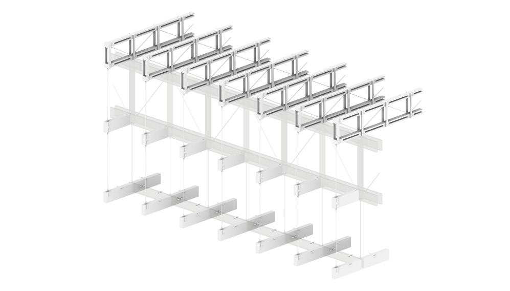 A full-height truss anchors the top floor, spanning the building’s length between reinforced concrete walls. This robust framework supports the floor below in tension, forming the signature “floating bar.” Repetitive bay spacing clarifies the structural concept, exposing the building’s tectonic identity and maximizing open, flexible space beneath.