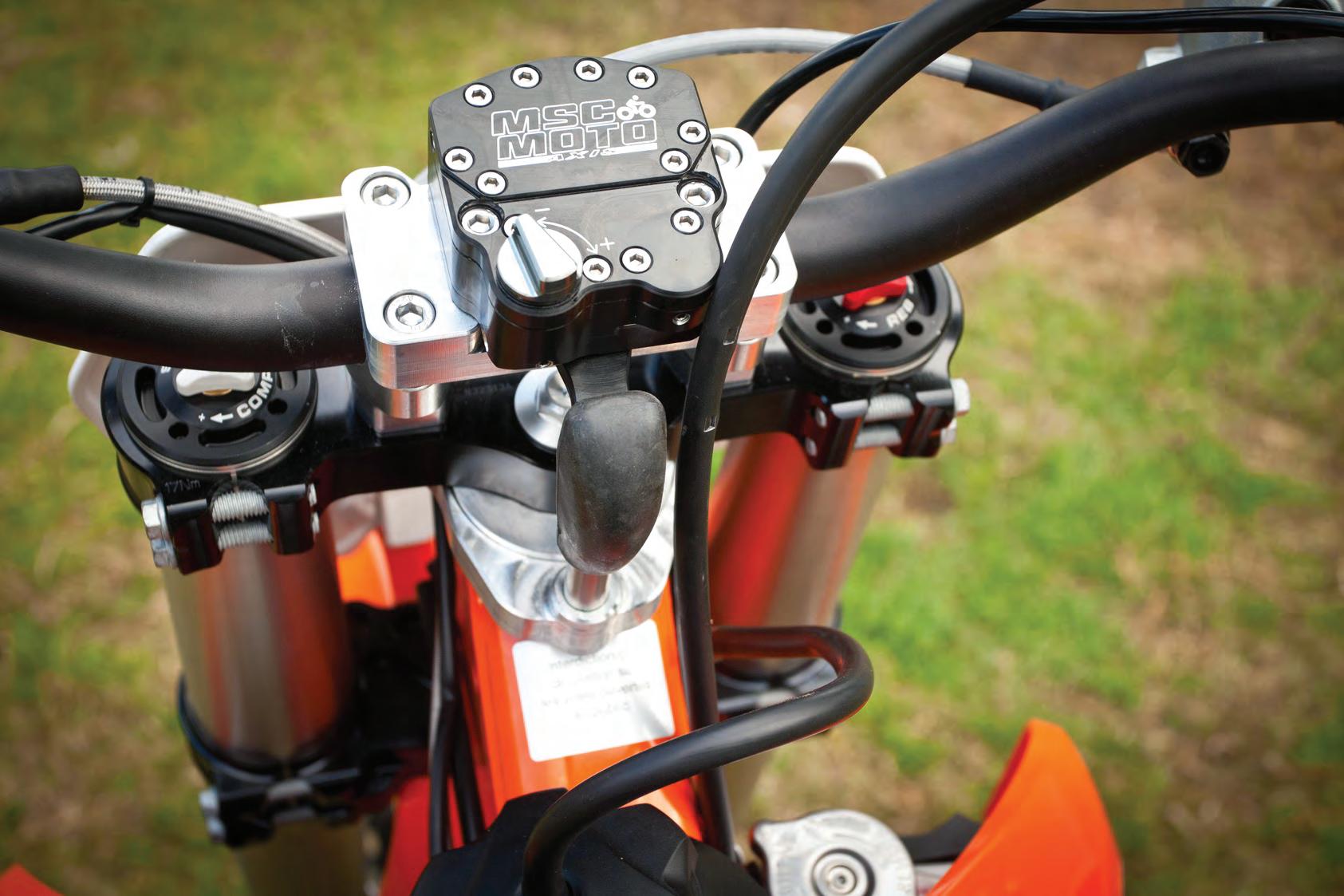 On a KTM it will raise the bars 25mm while on some other models like a Yamaha, it may go up 30mm because of how far the steering stem protrudes through the triple clamp. MSC produces a Top-Mount Steering Damper with a bar pad included which is the ideal solution if you don't want to raise the height of your handlebars.